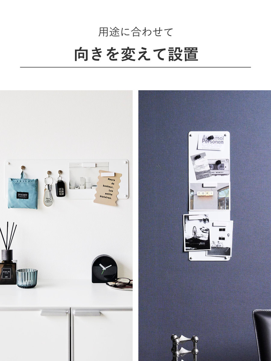 壁の穴が目立ちにくい石こうボードピンで簡単に取り付けできます。木ネジでの取り付けも可能です。設置場所や用途に合わせて縦横お好みの向きに設置できます。