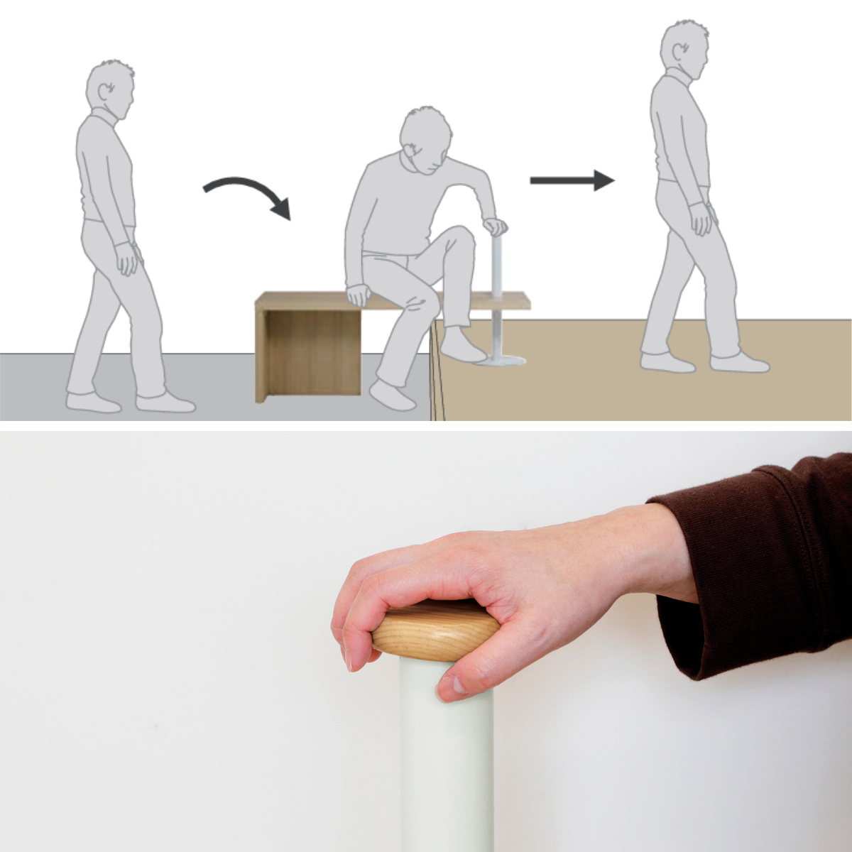 握りやすい木製ハンドルの付いた補助ポールを装備。自然で安定した動作をサポートします。更にベンチの下には靴を収納できるスペースを備え、玄関をすっきりと保てます。
