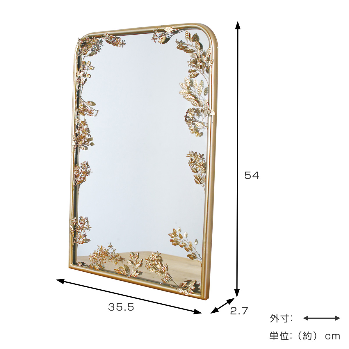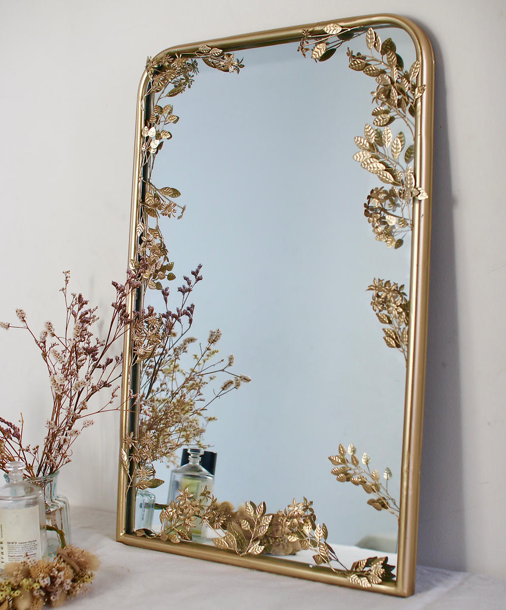 花と葉の繊細な装飾が施されたマットゴールドのフレームが柔らかく輝く美しいミラーです。そこに置いておくだけでインテリアになるような上品な佇まいが魅力です。
