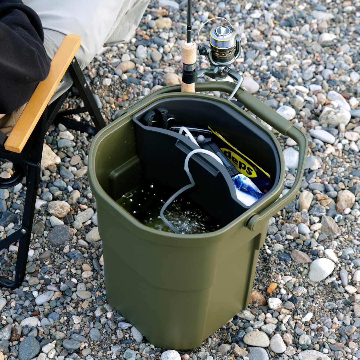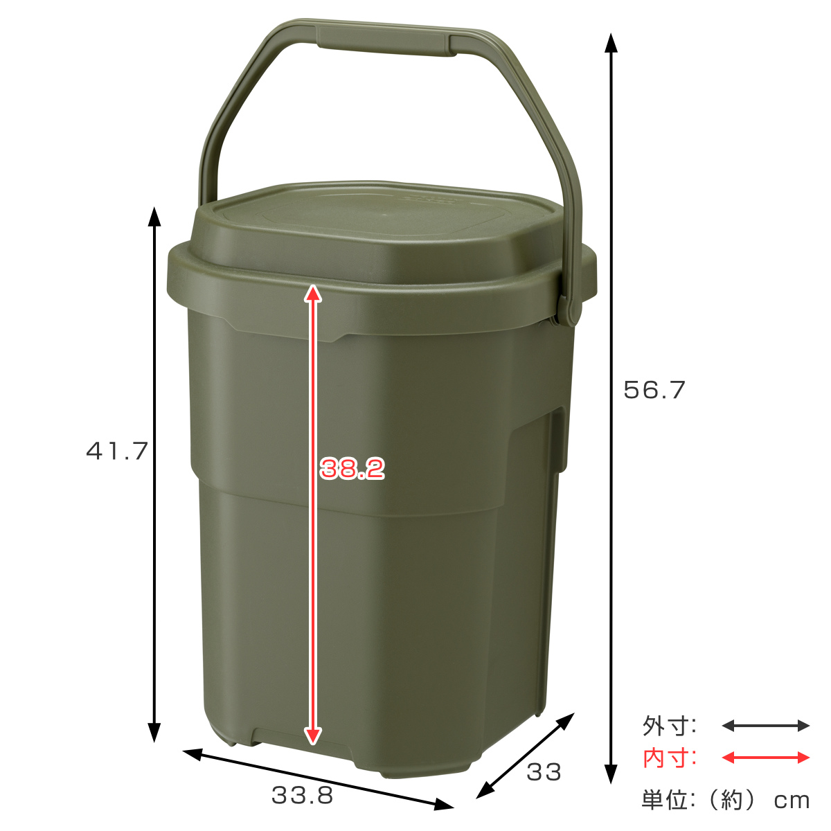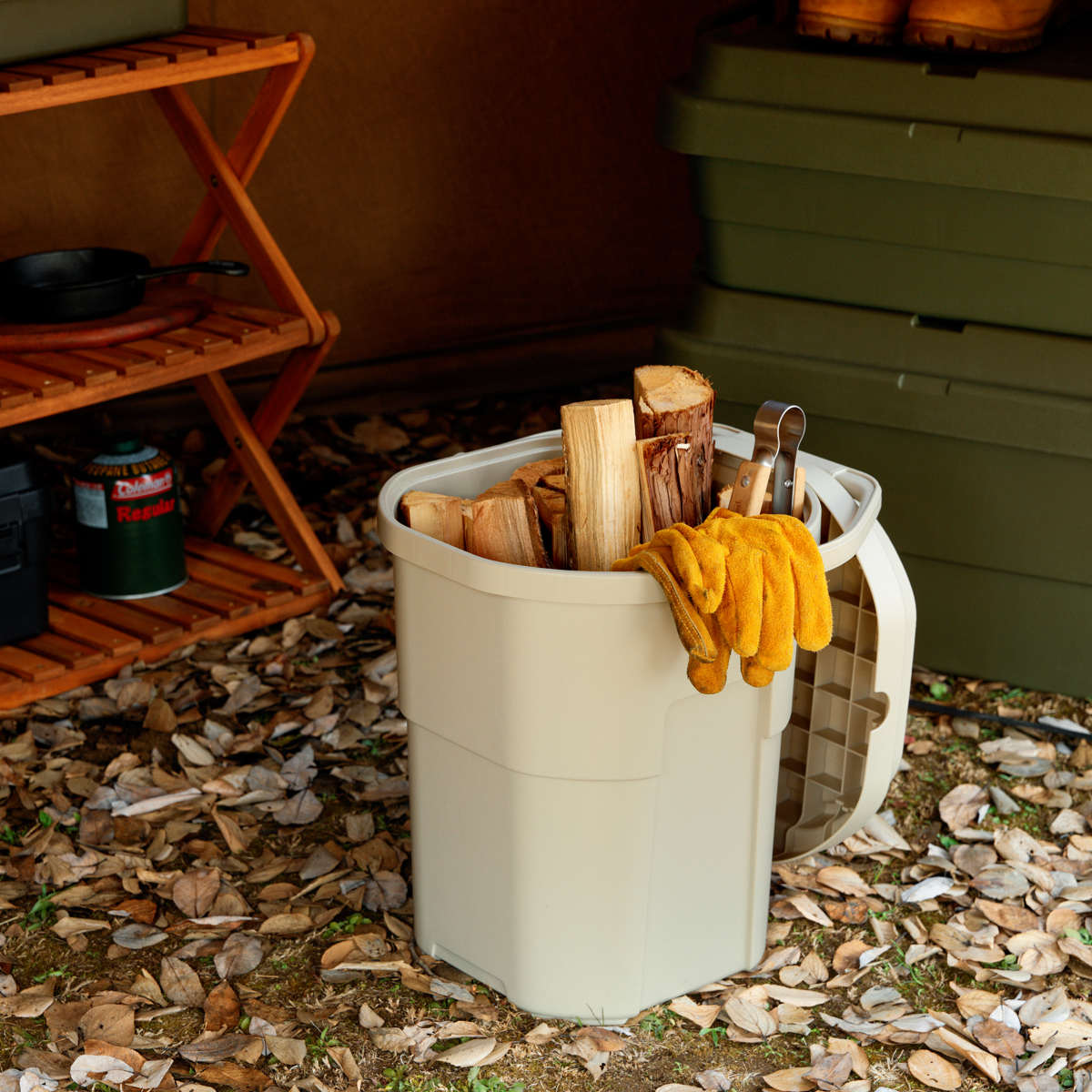 内寸の高さが38.2cmあるので薪や火ばさみなどを立てて収納できます。耐荷重100kgの頑丈さと、長尺物や液体を持ち運べる便利さをプラスしたバケツ型収納容器です。