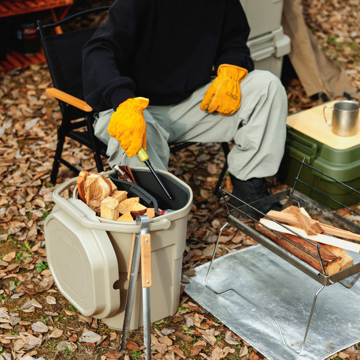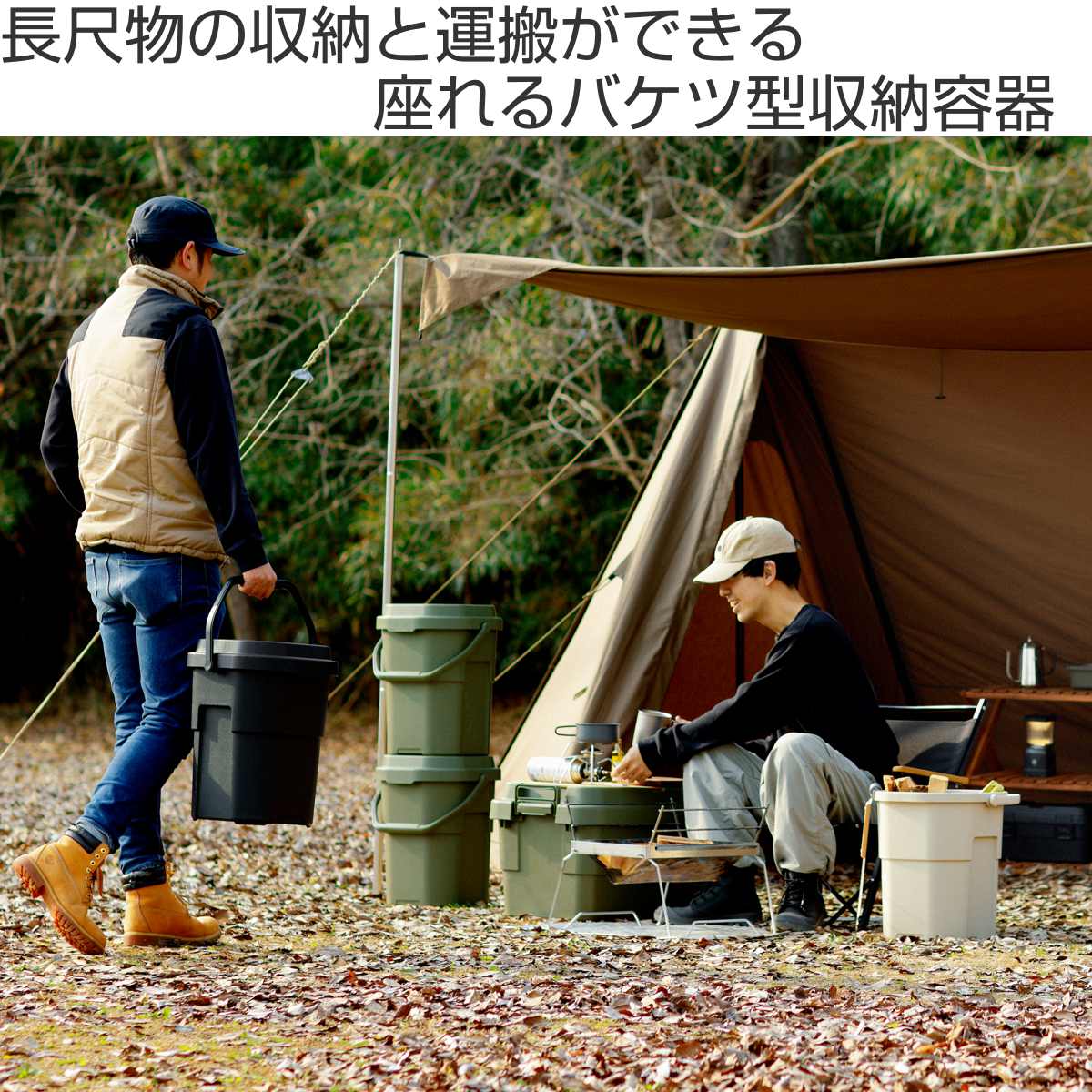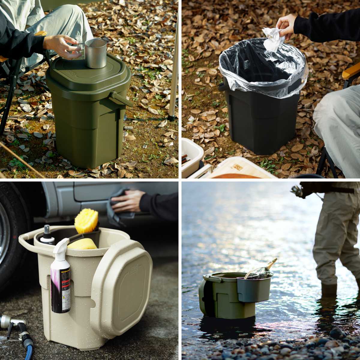 キャンプシーンでは薪入れやスツール・簡易テーブル・即席ゴミ箱として、釣り・ガーデニング・洗車の道具など、用途に合わせた様々な使い方ができます。