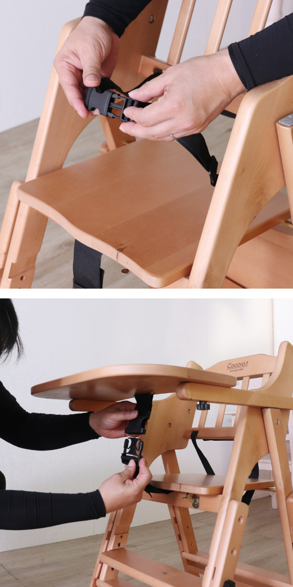 腰回りと座面部分にそれぞれベルトが付いているので、お子様がチェアからずり落ちるのを防いでくれます。