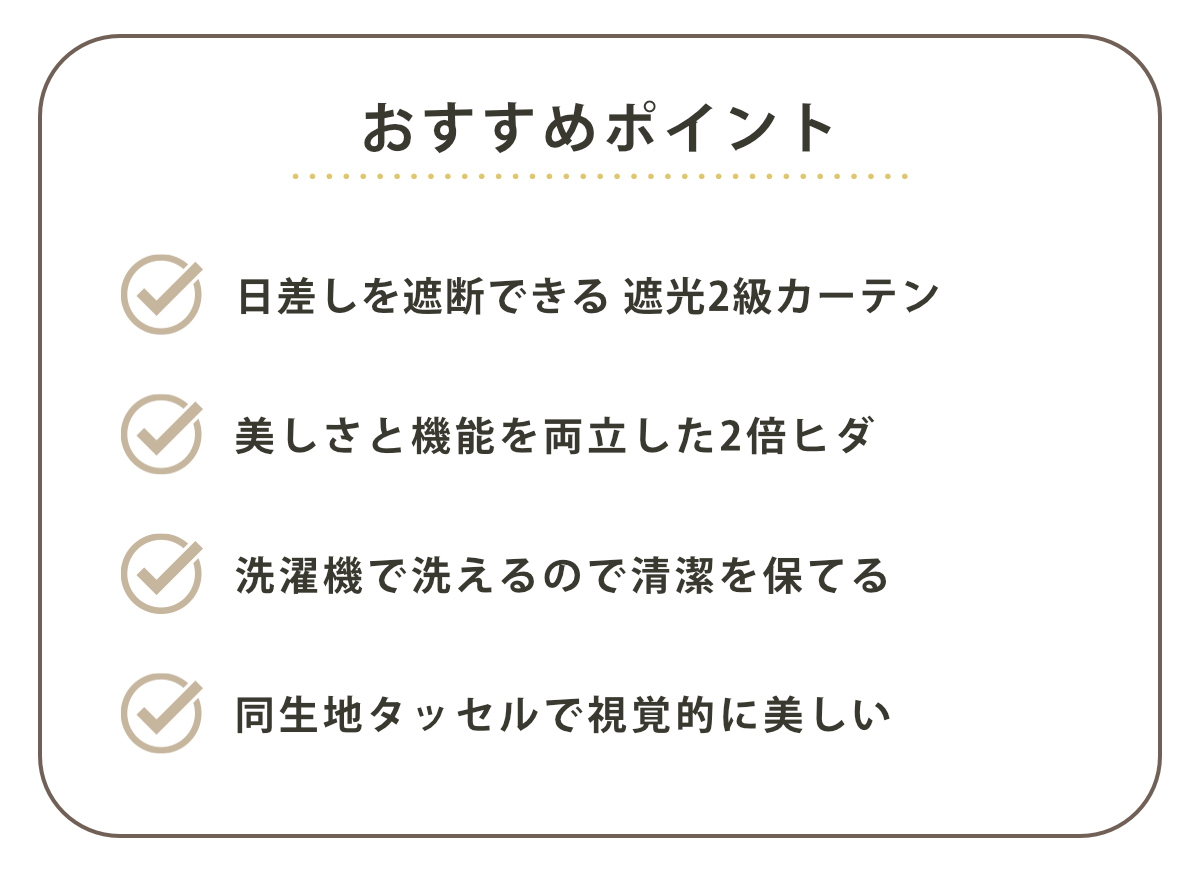 遮光2級のカーテンは遮光率が99.80%以上で、カーテンを閉めてもお部屋の中は真っ暗にはなりませんが、朝日や西日の眩しさを遮る必要最低限の遮光機能はしっかりと発揮し、外からお部屋の中は見えずプライバシーも保護します。