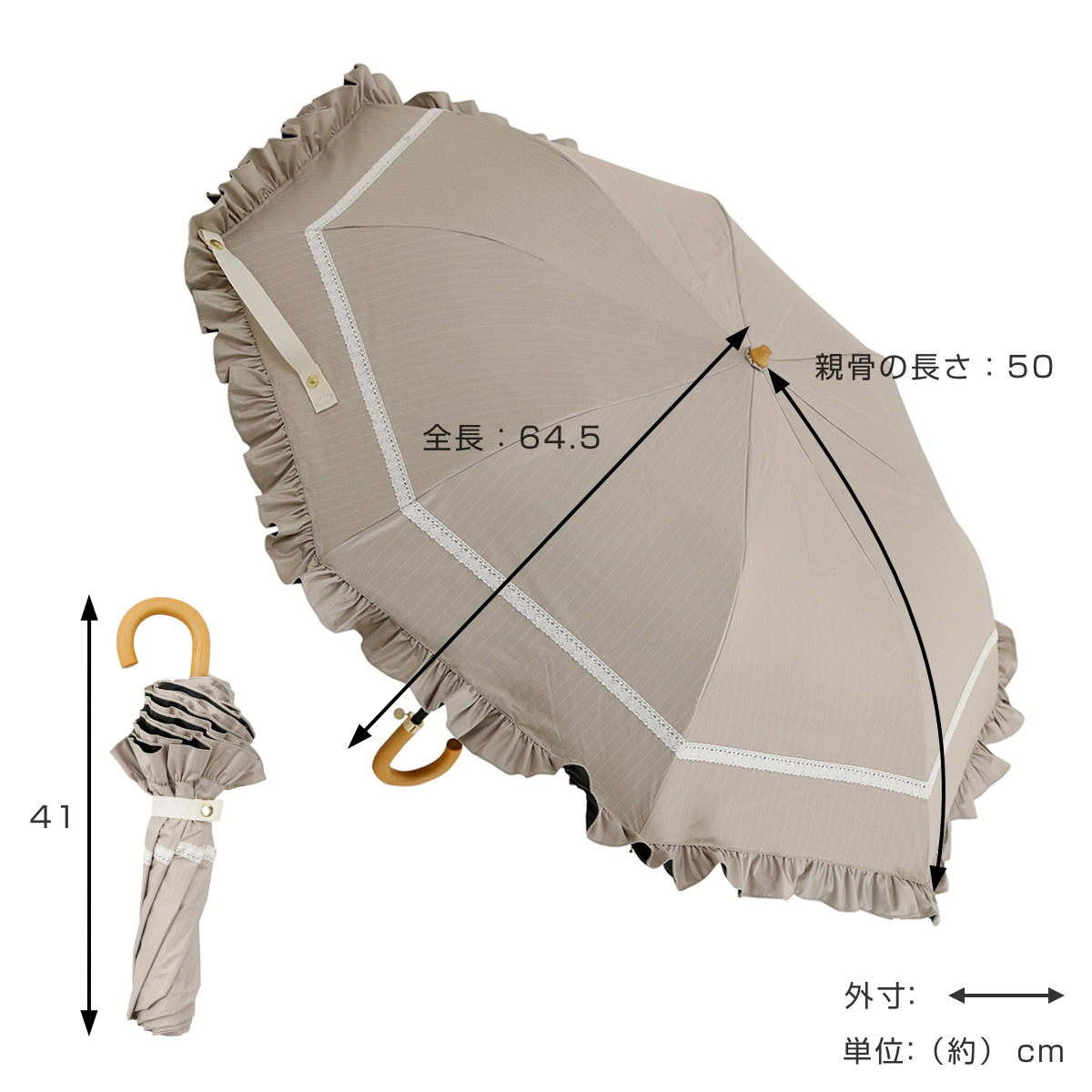 | サイズ | 【8本骨タイプ】 親骨の長さ:約 50cm、 全長:約 64.5cm 直径:約 90cm 持ち手の長さ:約9.5cm 持ち手の太さ:約 1.5cm 折りたたみ時の長さ:約 41cm |