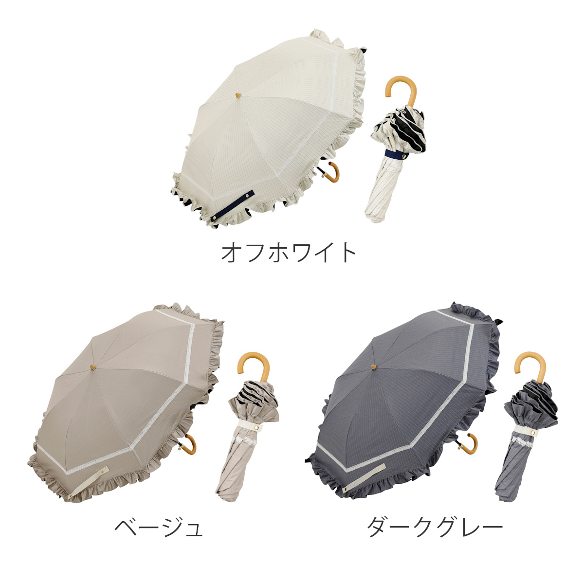 ![]() フリル 長傘 | ![]() フリル 折りたたみ傘 【▲このページの商品】 | ![]() 長傘 |