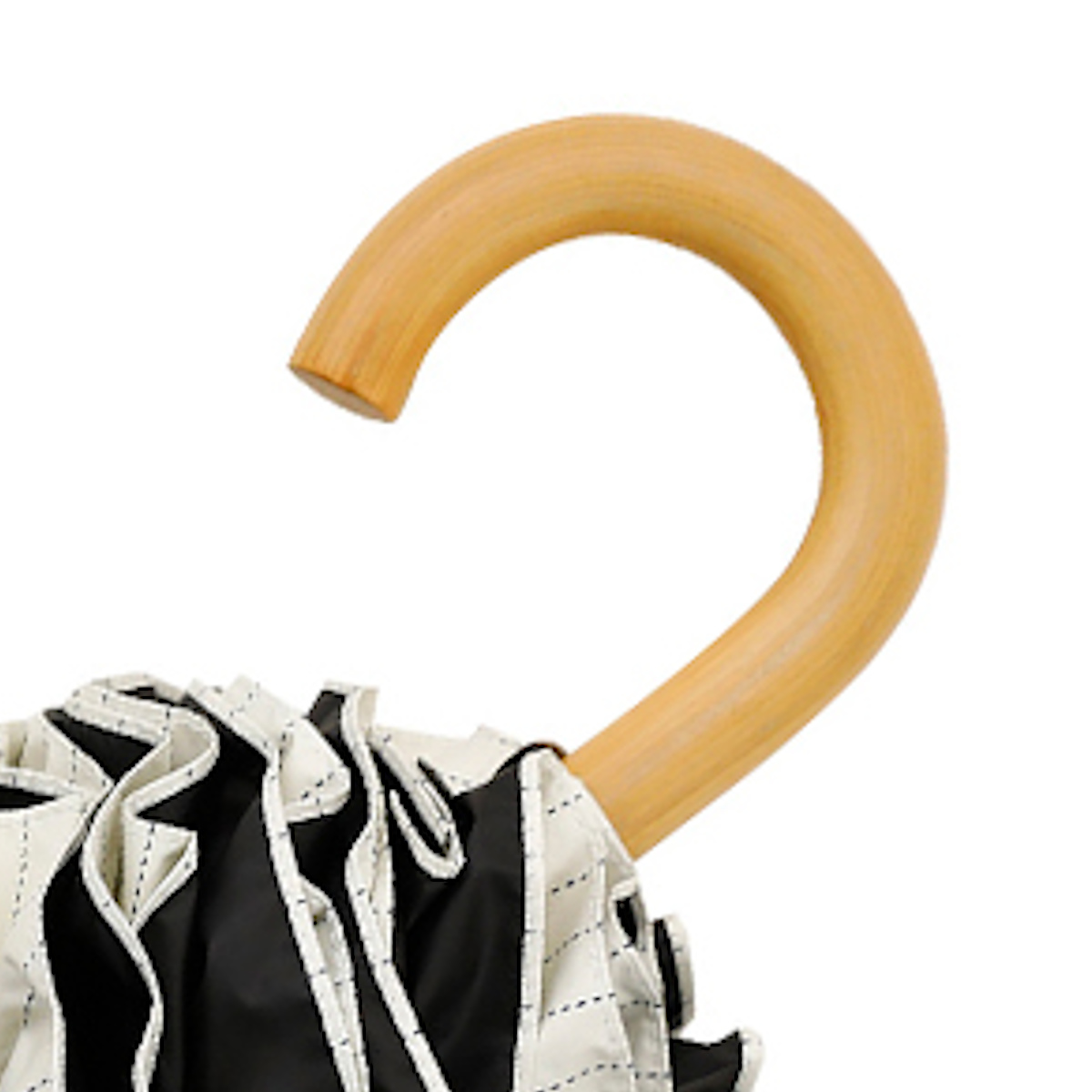持ち手は、傘のデザインに合わせて合板を採用しています。手に馴染みやすく、持ち歩くのに丁度良い太さです。長傘がコンパクトになったようなスタイルに折りたためる、機能性とデザイン性を兼ね備えたアイテムです。