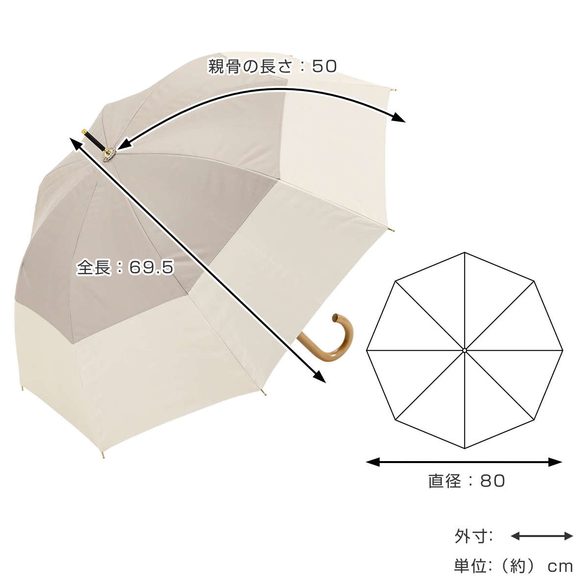 | サイズ | 親骨の長さ:約 50cm 全長の長さ:約 69.5cm 直径:約 80cm 持ち手の長さ:約 13.5cm 持ち手の太さ:約 1.5cm |