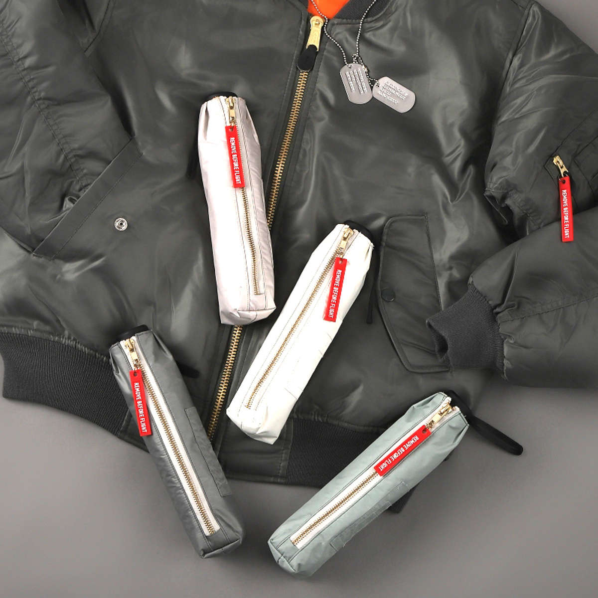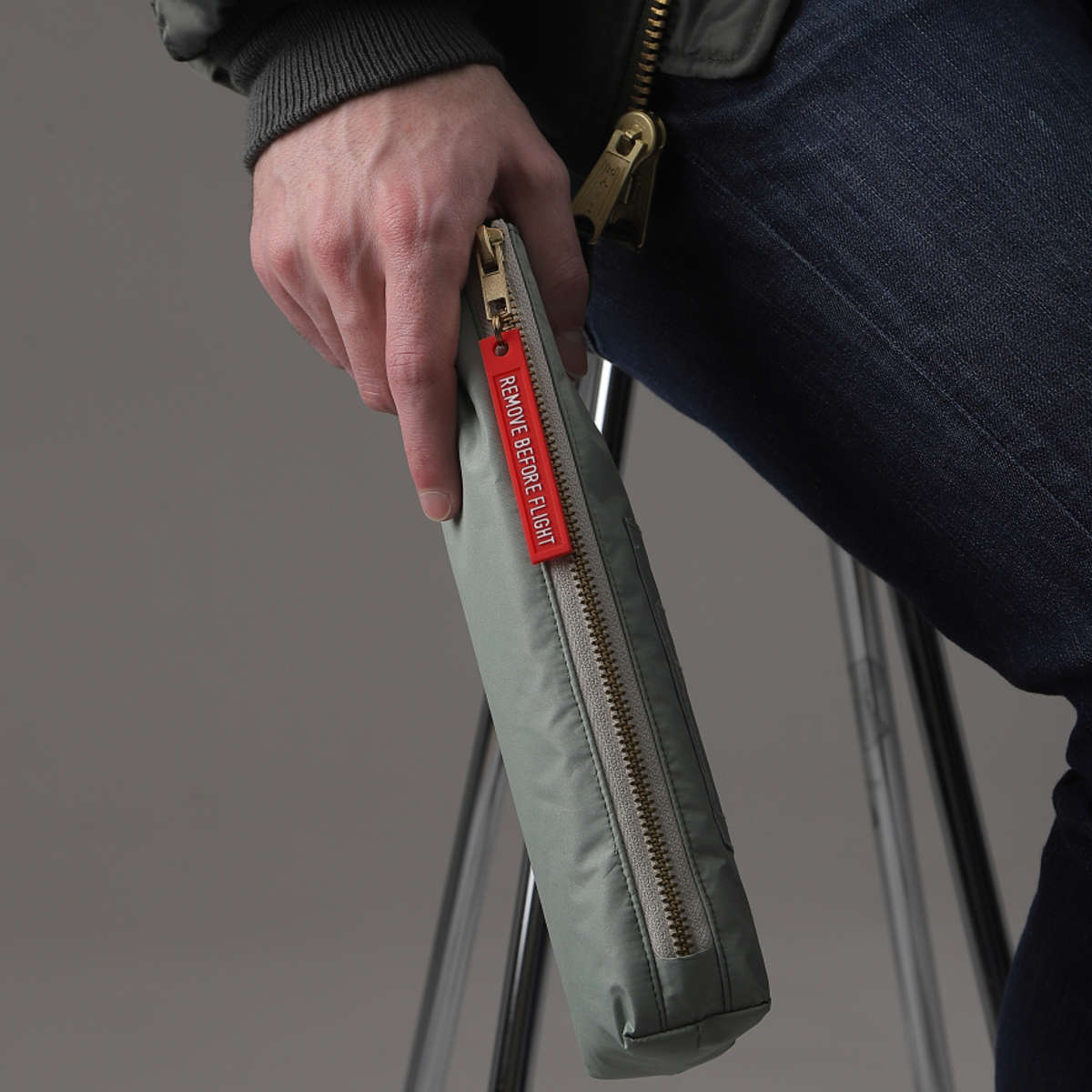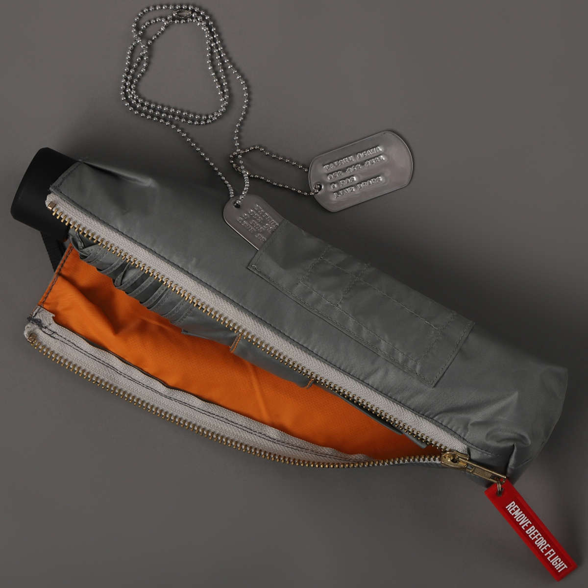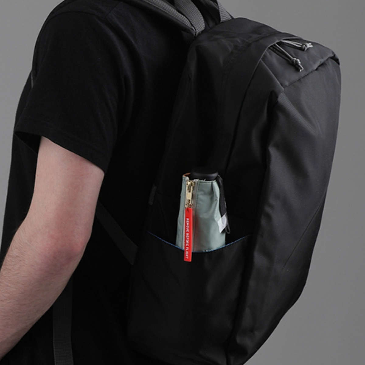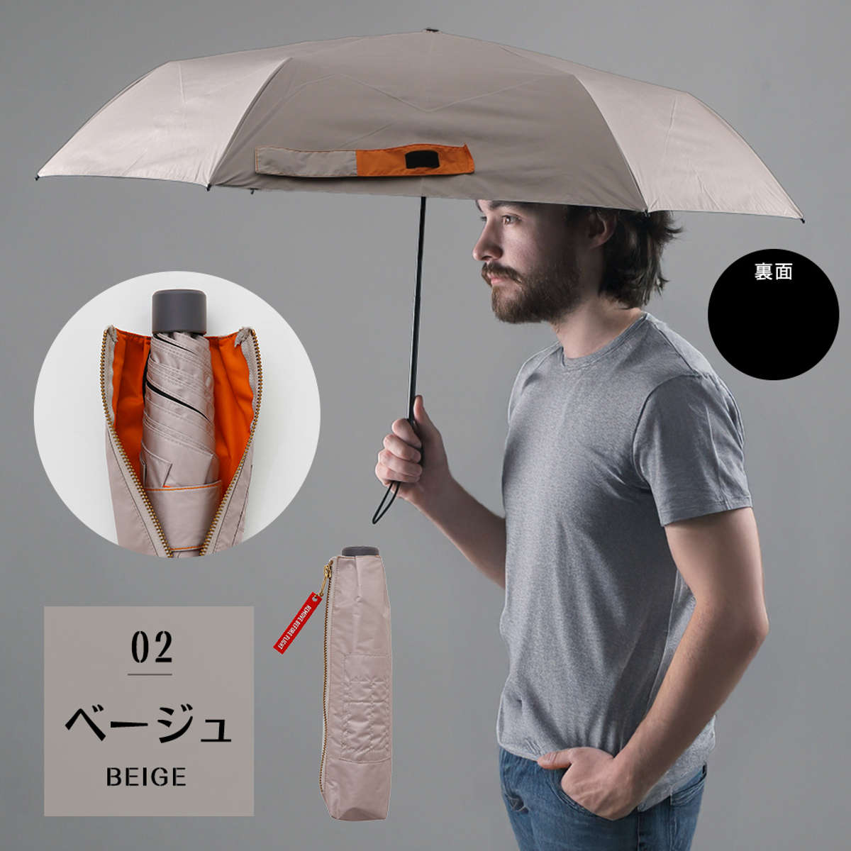 共袋はチャックの開口部が広く、折りたたんだ傘をスムーズに収納可能。内側の生地にはMA-1風のオレンジカラーを採用しており、デザインのアクセントとしても際立ちます。