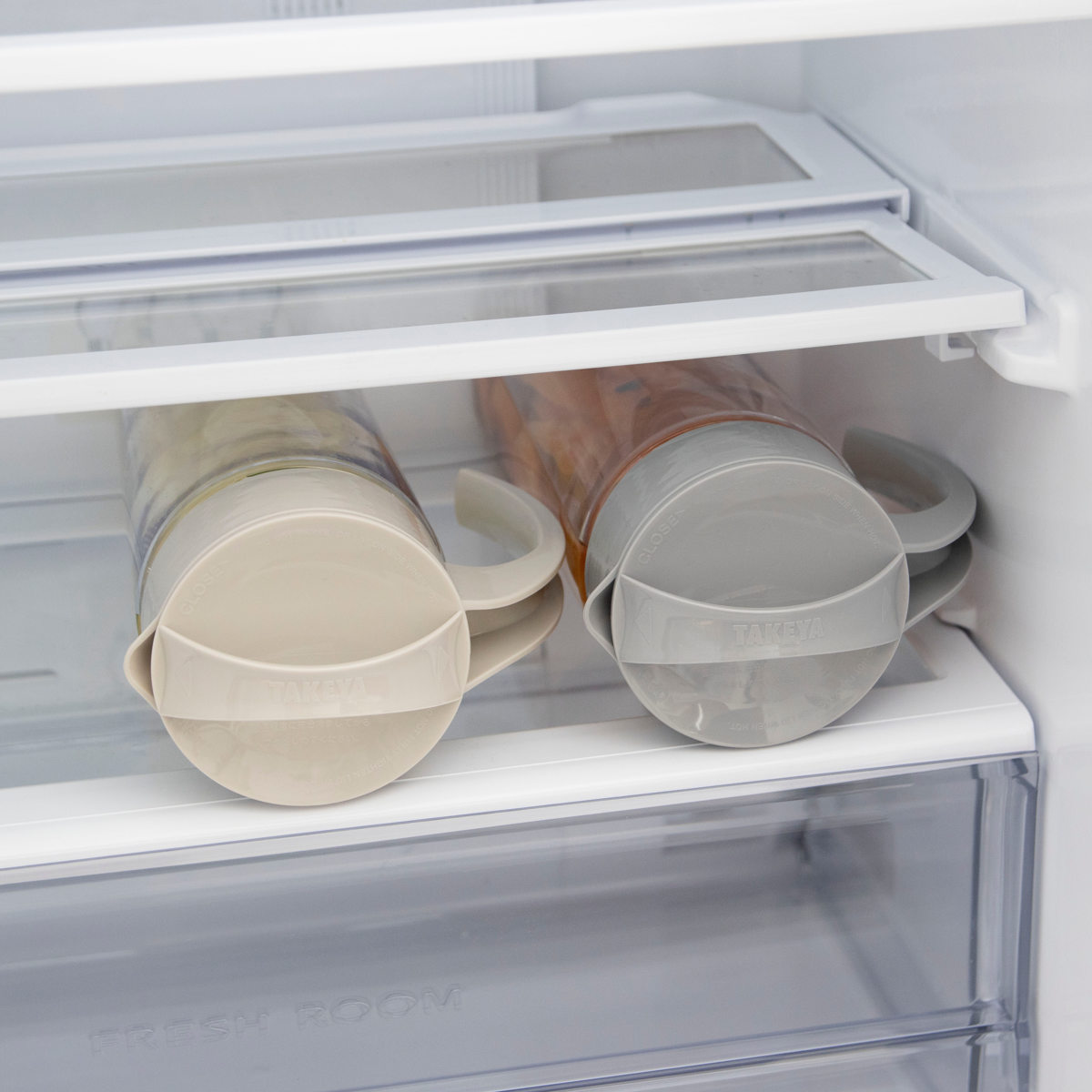 水漏れを防ぐパッキン付きでしっかり密封してくれるので、横向きに置けて、冷蔵庫の棚置きが可能です。冷蔵庫の空いたスペースを有効利用できます。