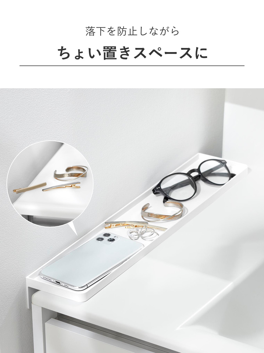 顔を洗う時や歯を磨く時にメガネやアクセサリー、スマートフォンのちょい置きに便利なトレーです。隙間に小物が落下するのを防止しながら、洗面小物を置くことができる便利なアイテムです。