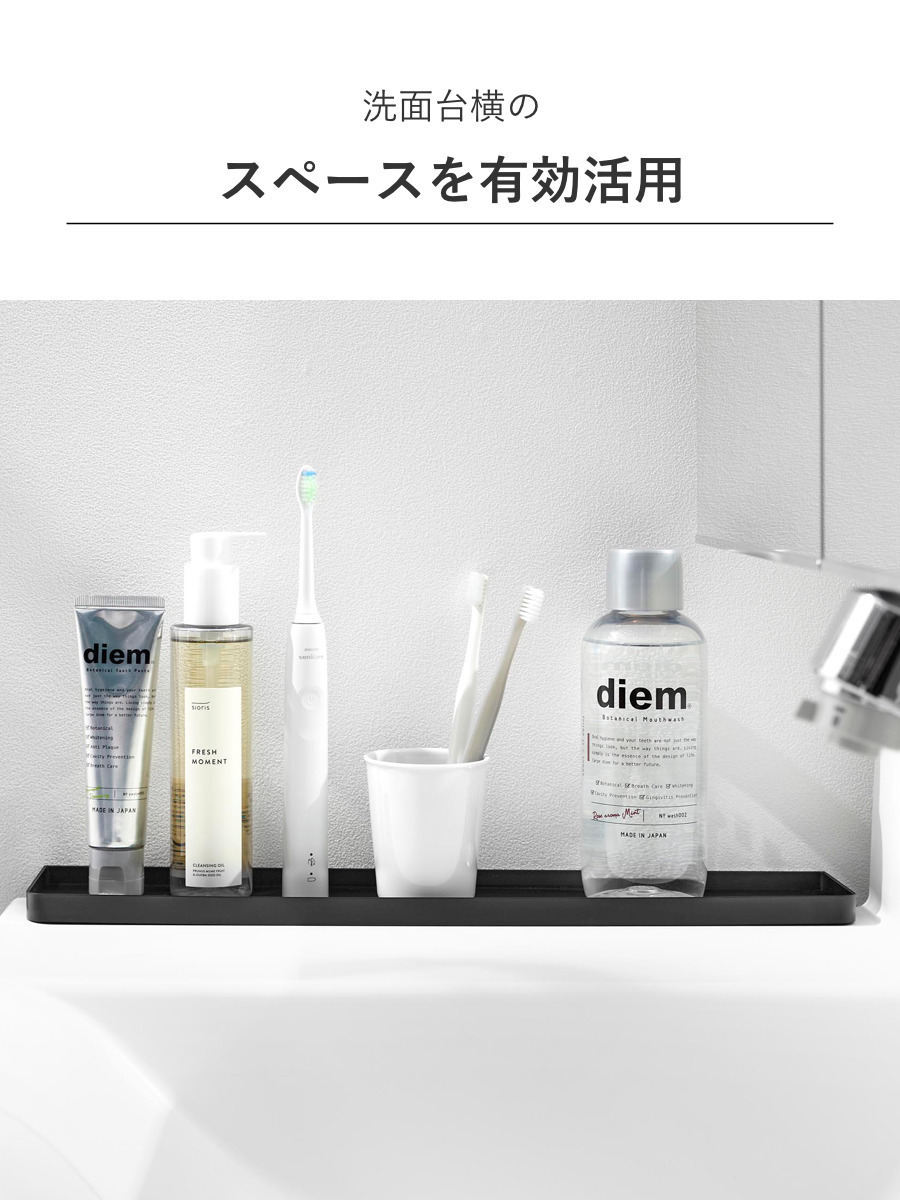 トレーは、奥行きが44cmあるので洗面台を有効に使用することができます。洗面台に収納スペースがなくても歯磨き粉、ヘアケア用品、タンブラーなどをまとめて収納できます。
