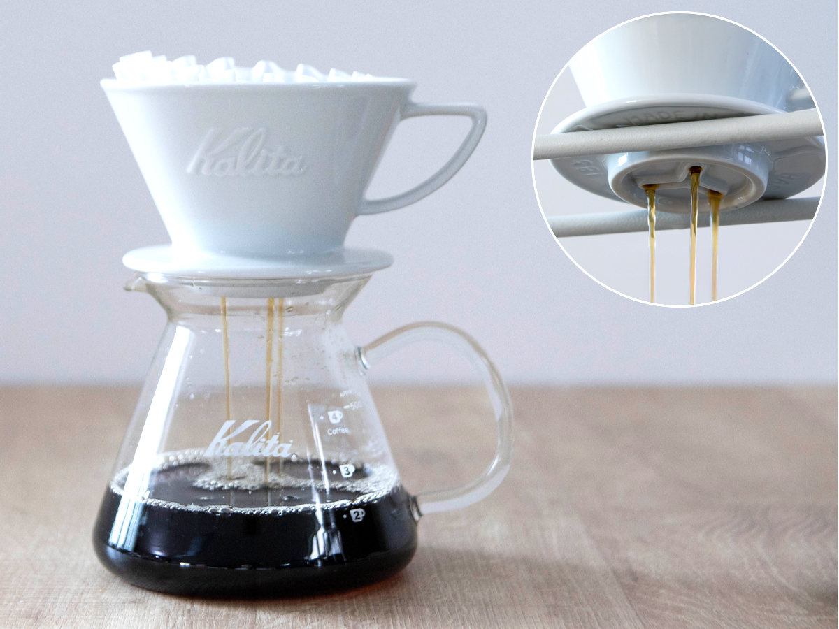 カリタ独自の三つ穴構造のドリッパーは、長時間フィルターとウェーブゾーンにコーヒー液がとどまらず、雑味成分の抽出が少なく美味しさだけをドリップできます。