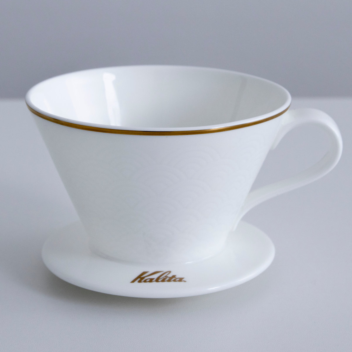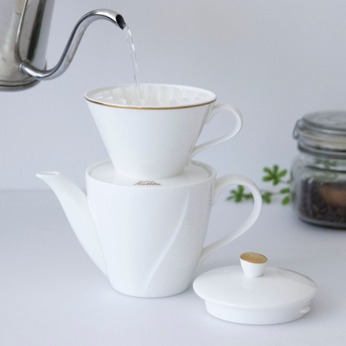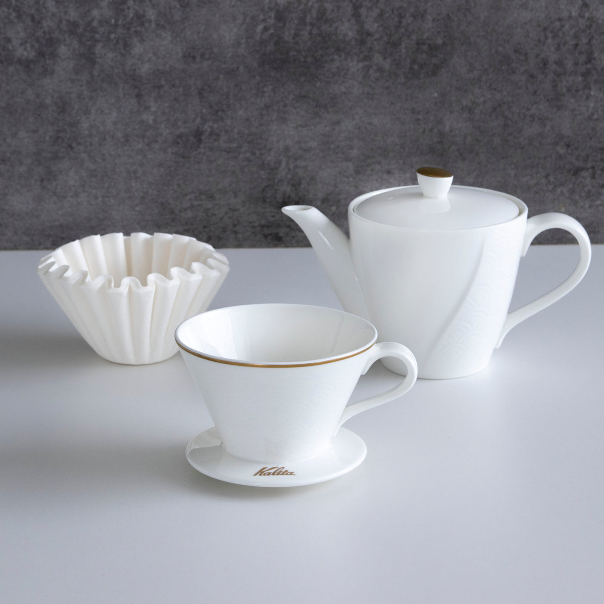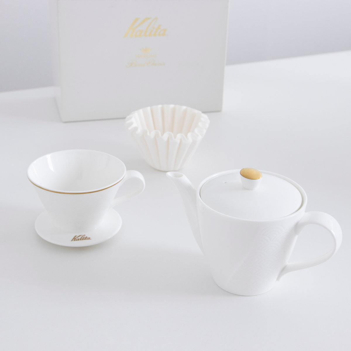 世界のバリスタから愛される、「カリタ」のドリップギフトセットです。ボーンチャイナで作った特別なウェーブドリッパーとコーヒーポットは、使う人を選ばないシンプルで清潔感のあるホワイトカラーの青海波柄です。