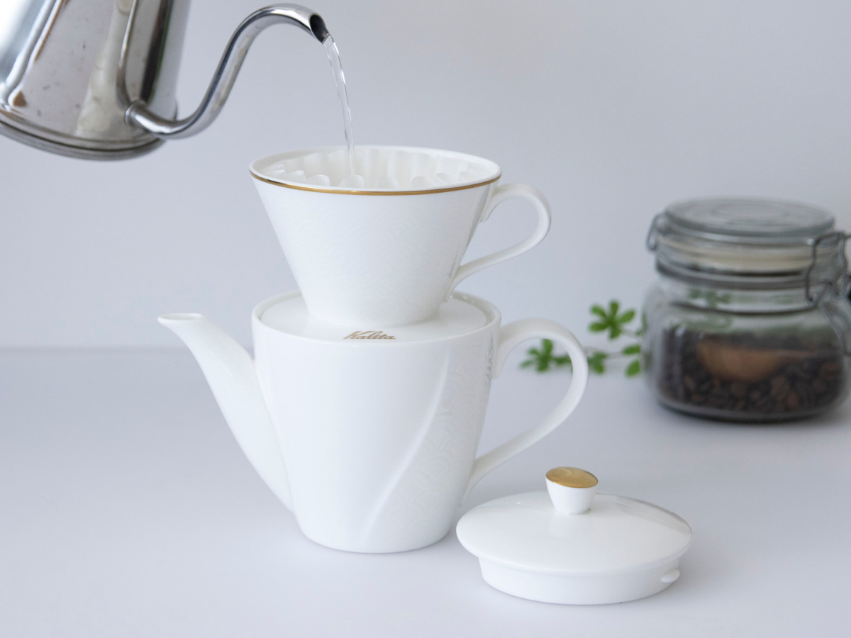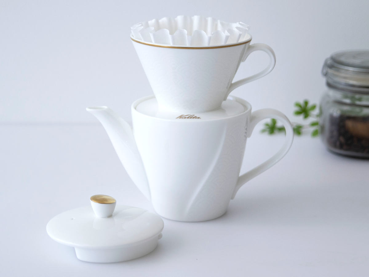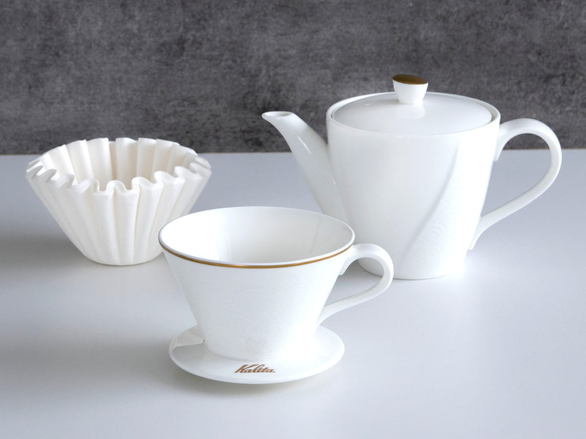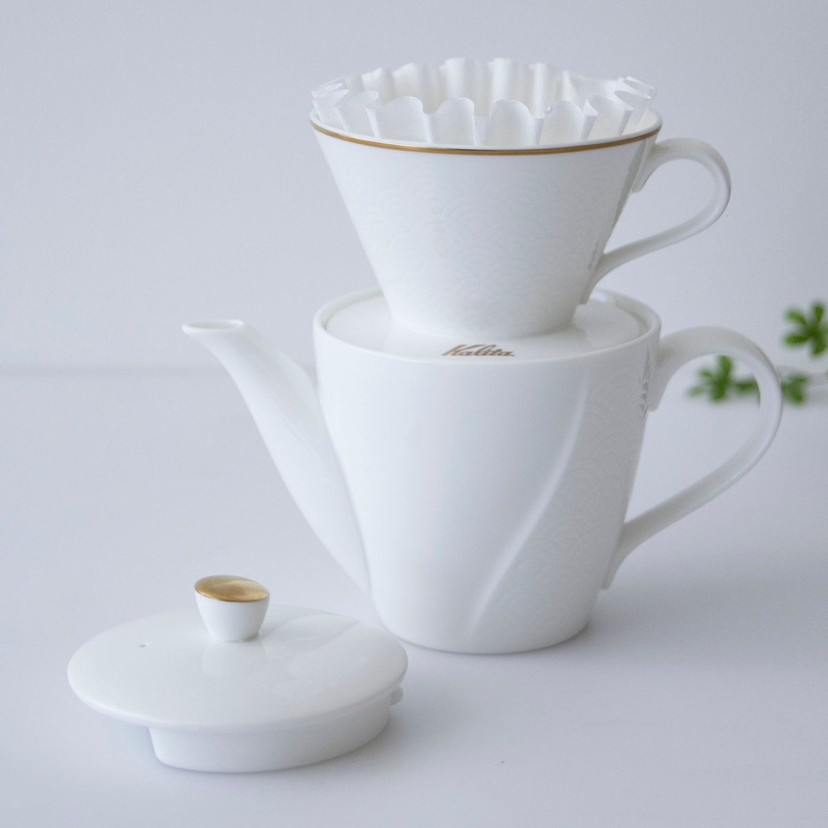 世界のバリスタから愛される、「カリタ」のドリップギフトセットです。ボーンチャイナで作った特別なウェーブドリッパーとコーヒーポットは、使う人を選ばないシンプルで清潔感のあるホワイトカラーの青海波柄です。