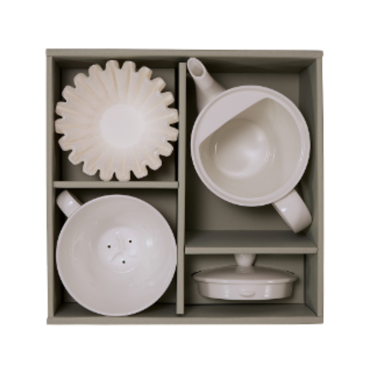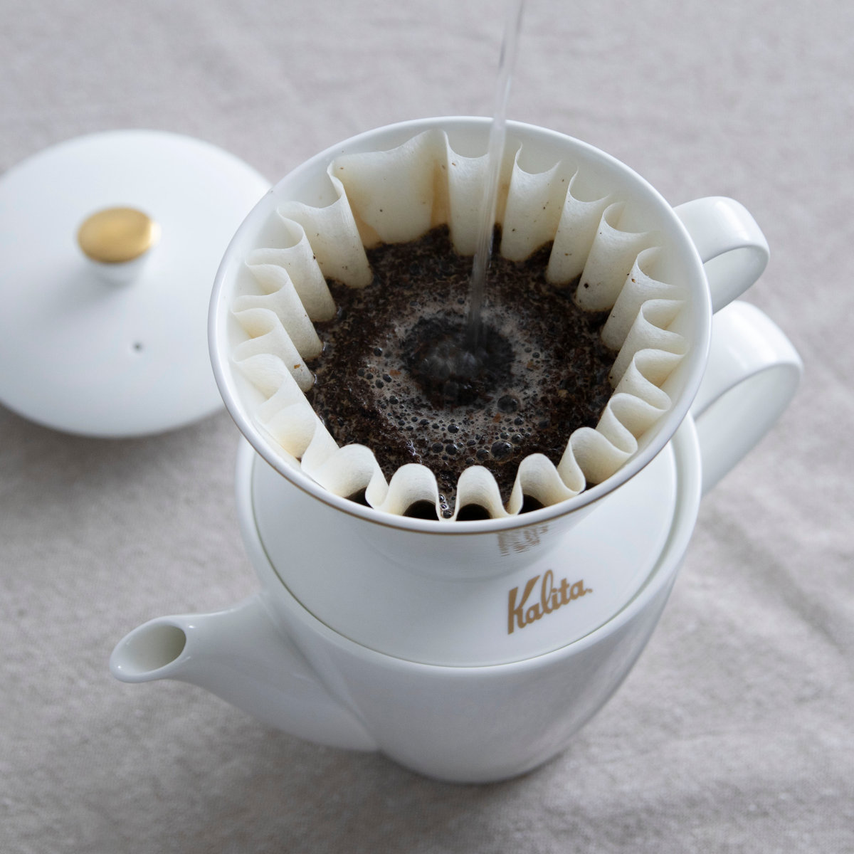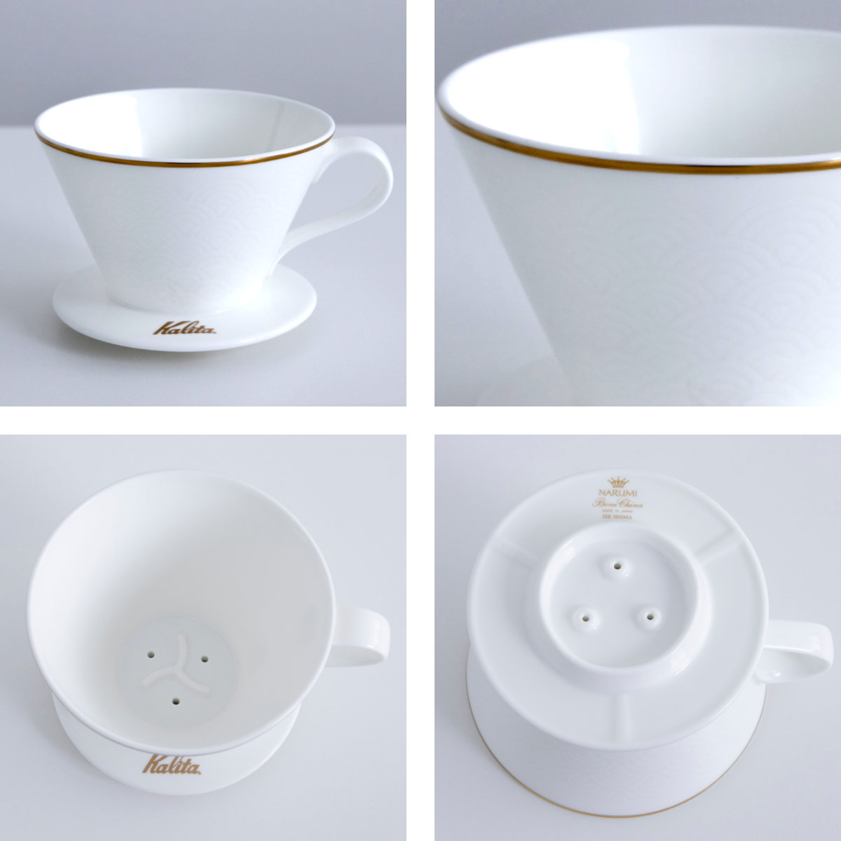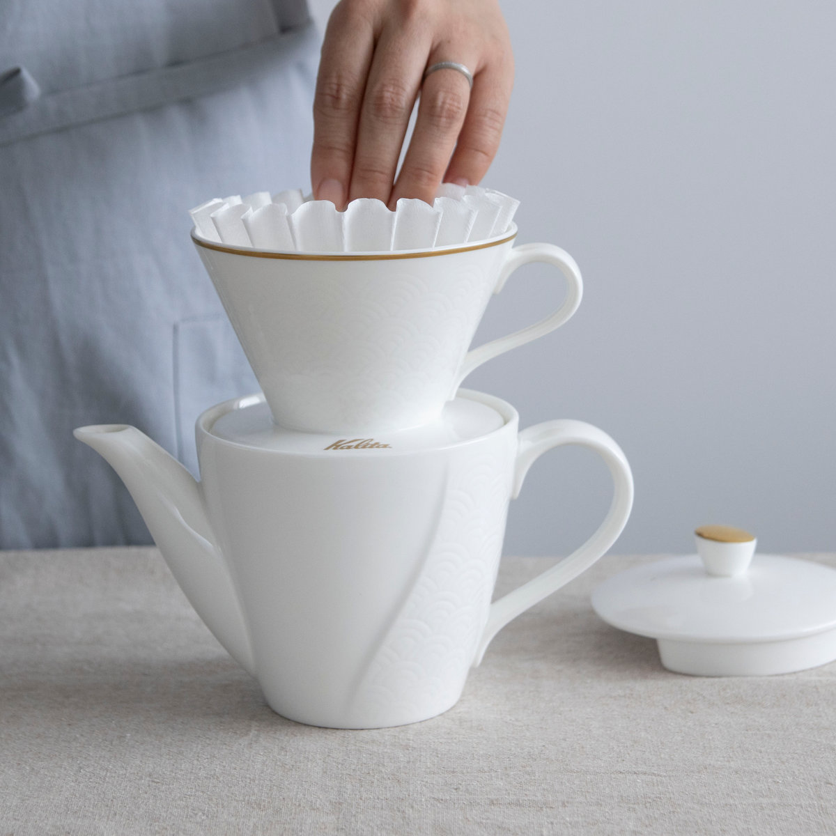 世界のバリスタから愛される、「カリタ」のドリップギフトセットです。ボーンチャイナで作った特別なウェーブドリッパーとコーヒーポットは、使う人を選ばないシンプルで清潔感のあるホワイトカラーの青海波柄です。