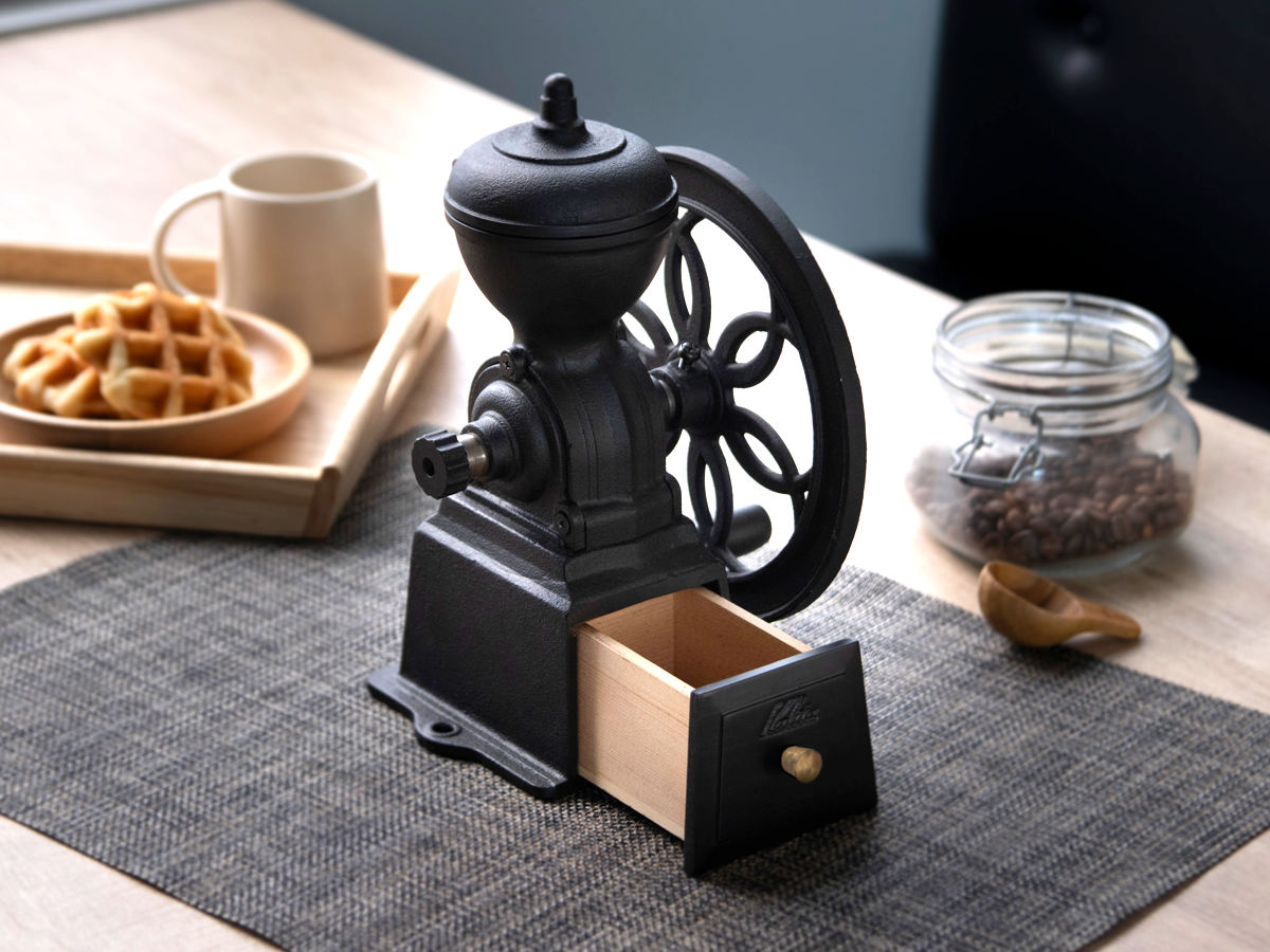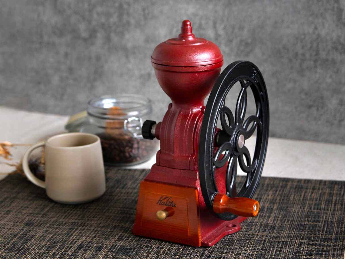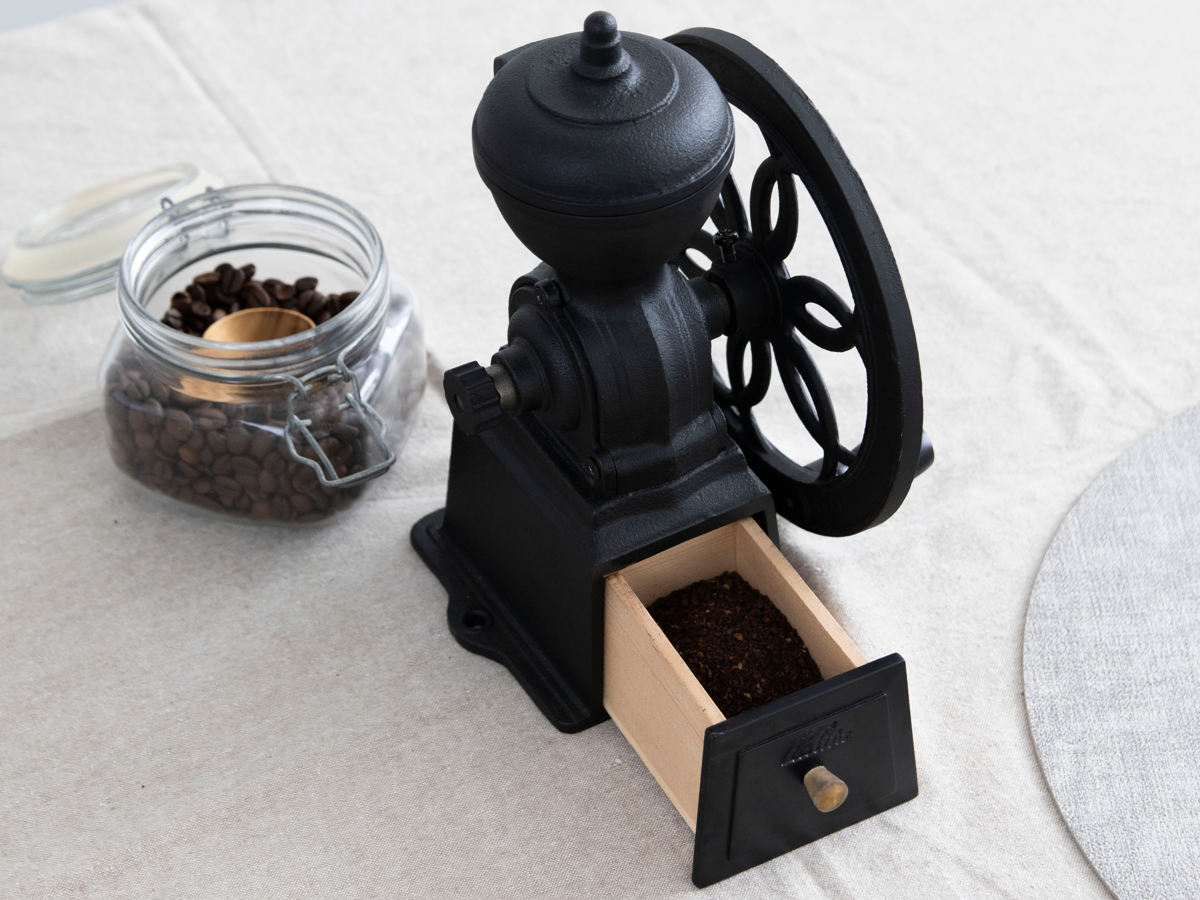カリタの手挽きコーヒーミルです。挽きたての豆から立ちのぼる香りは、手で挽くからこそより深く感じられます。ハンドルをゆっくり回しながら豆を挽く時間は、忙しい毎日にほんの少しのゆとりをもたらしてくれます。