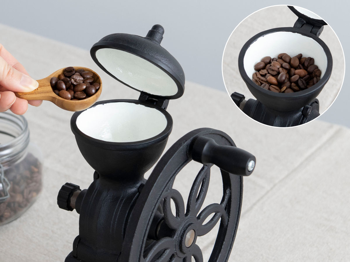 コーヒー豆の投入口が広く、オープン式なので上から簡単に豆が入れられます。重厚感のあるしっかりした蓋は、挽きカスなどが飛び散るのを防ぎます。