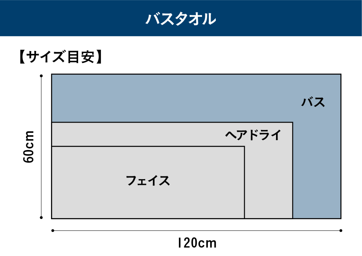 ●「フェイスタオル」「へアドライタオル」「バスタオル」の3サイズ展開です。