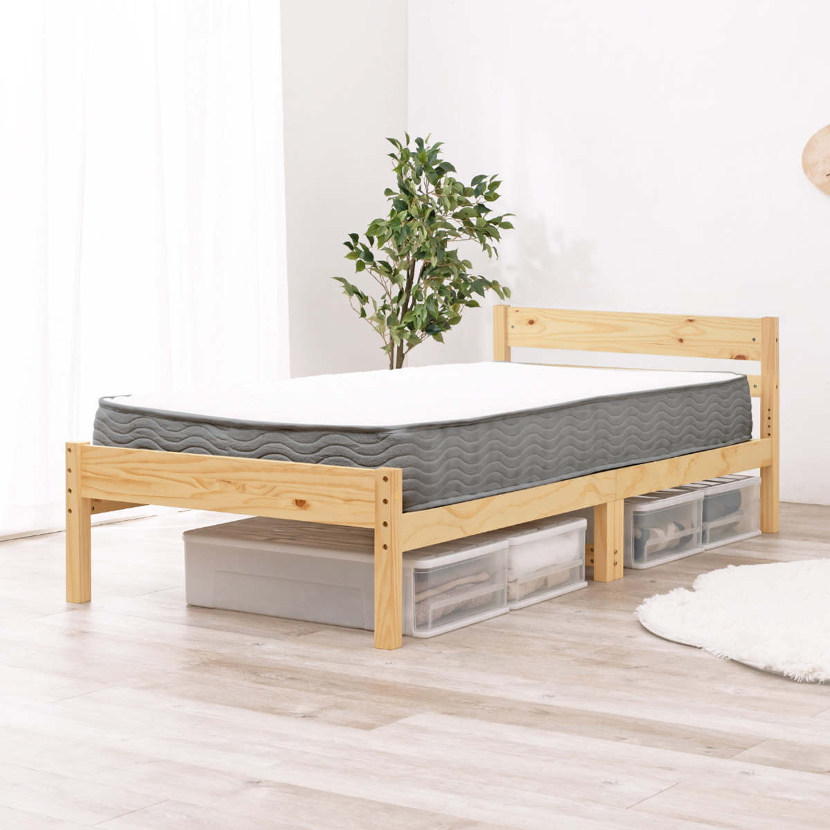 ナチュラルな風合いがお部屋に映えるベッドフレームです。床面は通気性の良いすのこで、汗や湿気を溜め込まず、年中快適におやすみいただけます。天然木の温もりが感じられる柔らかなパイン材を使用しているので、美しい木目と経年による色の変化を楽しめます。
