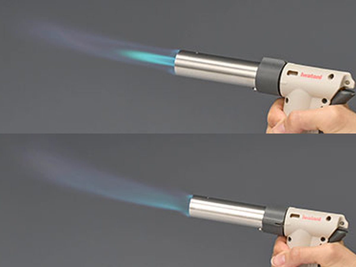 炎調節つまみを右方向(時計回り)に回すと細くとがった炎に、左方向(反時計回り)に回すとやわらかく広がった炎に調整が可能です。