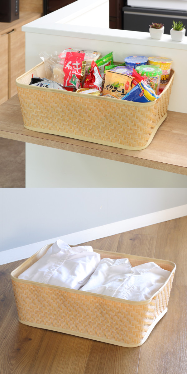 お掃除道具をまとめたり、食品・日用品ストックを入れたりと、さまざまな場所の整理整頓に役立ちます。衣類収納にも適した大きさです。