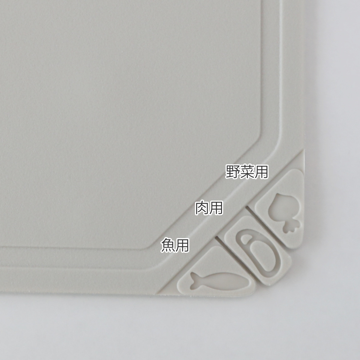 まな板の角の部分には食材別インデックス付きで、使わないインデックスはハサミで切り取って使用できます。野菜用、肉用、魚用に使い分けができるので、衛生的にお使いいただけます。