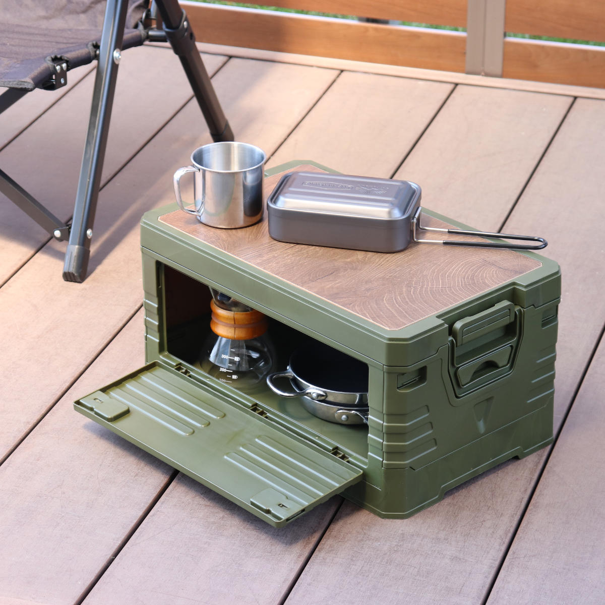 キャンプやバーベキューに活躍するコンテナボックスです。コンテナには大きく開く前ドアが付いていて、蓋の上に物を乗せたままでも中身がサッと取り出せます。調理器具や食器など必要なものをまとめて収納できます。