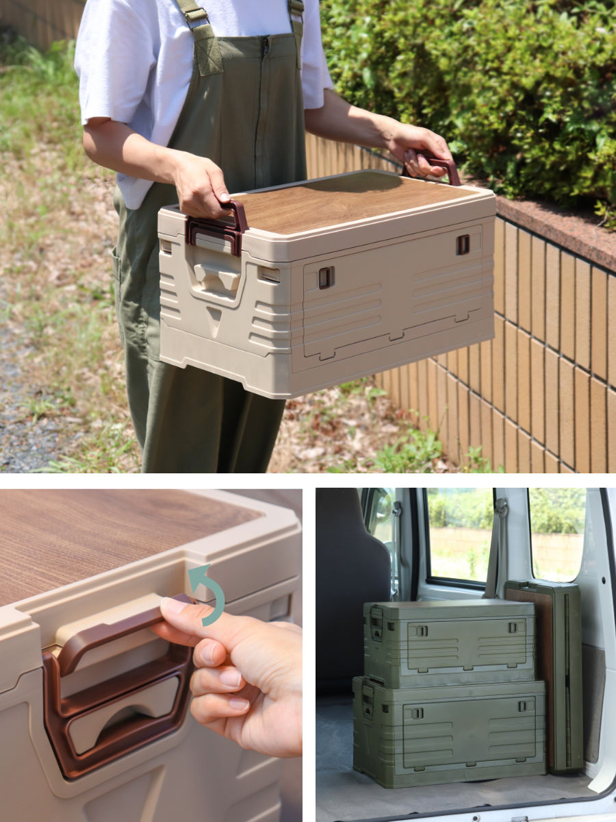 コンテナの両サイドには持ち運びに便利な取っ手が付いています。蓋と本体をしっかり固定できるロック付きで、移動時や積み重ね時も蓋が開いてしまう心配がなく、安心です。スタッキングできるので車の荷台にも積みやすく、使わないときはコンパクトにたためるので場所を取りません。