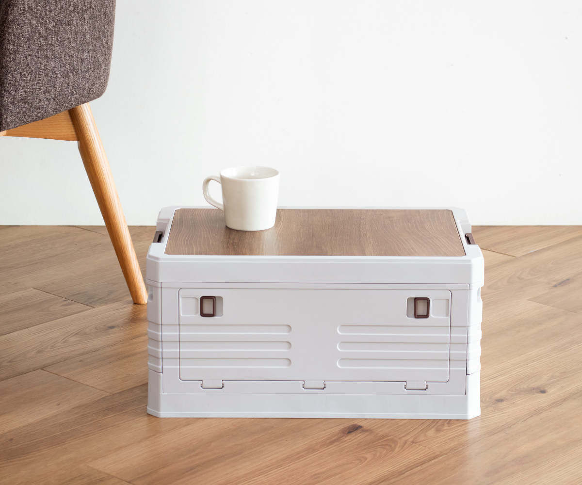 蓋には温かみを感じられる木目調の天板が付いています。アウトドアやレジャーシーンではテーブルとしてもお使いいただけます。また、天板は取り外しが可能です。