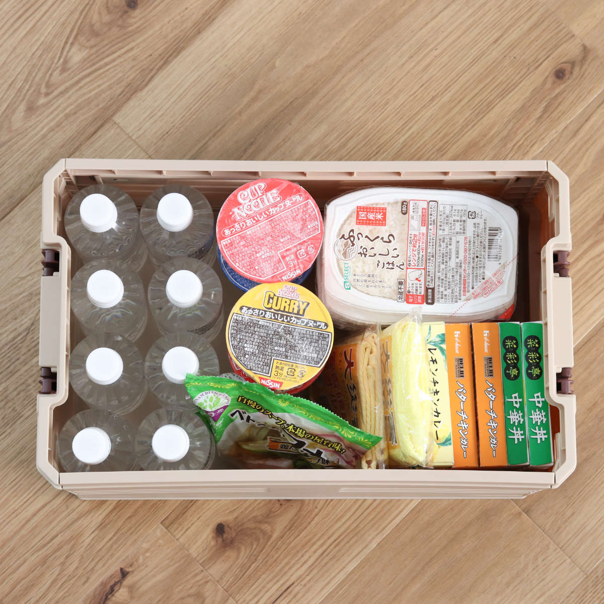 約35Lのたっぷり収納です。500mlのペットボトルを8本入れても食品を入れるスペースが十分あります。パントリーでは食材や日用品のストックとして、災害時では備蓄品入れとして活躍します。
