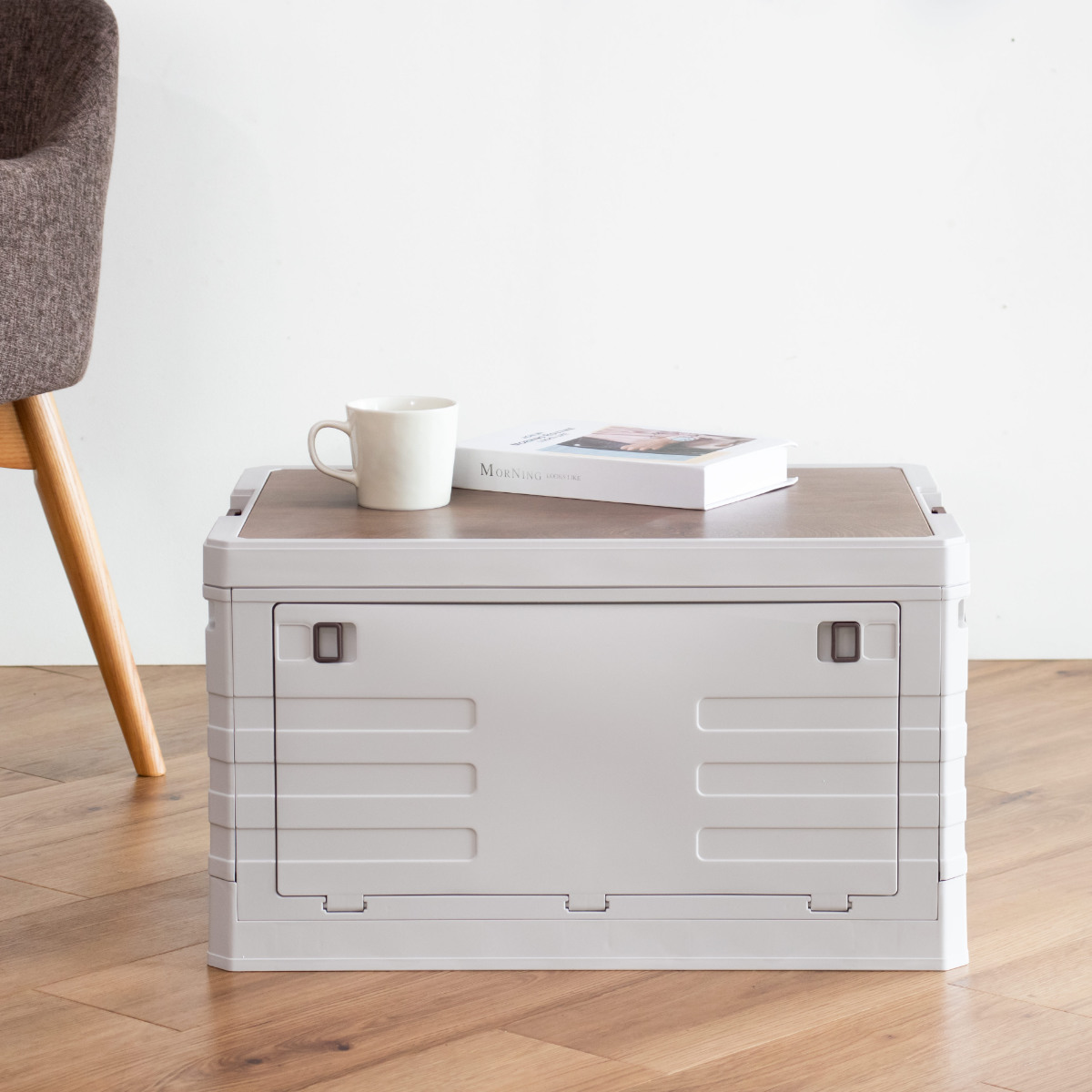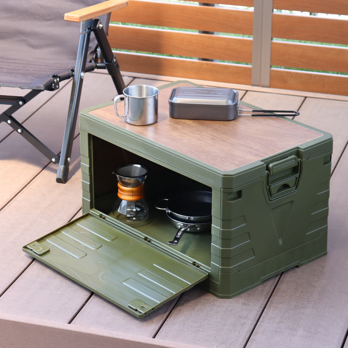 蓋には温かみの感じられる木目調の天板が付いています。アウトドアやレジャーシーンではテーブルとしてもお使いいただけます。また、天板は取り外しが可能です。