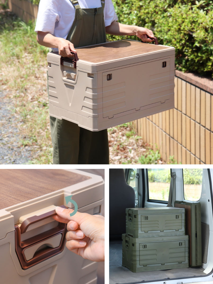 コンテナの両サイドには持ち運びに便利な取っ手が付いています。蓋と本体をしっかり固定できるロック付きで、移動時や積み重ね時も蓋が開いてしまう心配がなく、安心です。スタッキングできるので車の荷台にも積みやすく、使わないときはコンパクトにたためるので場所を取りません。