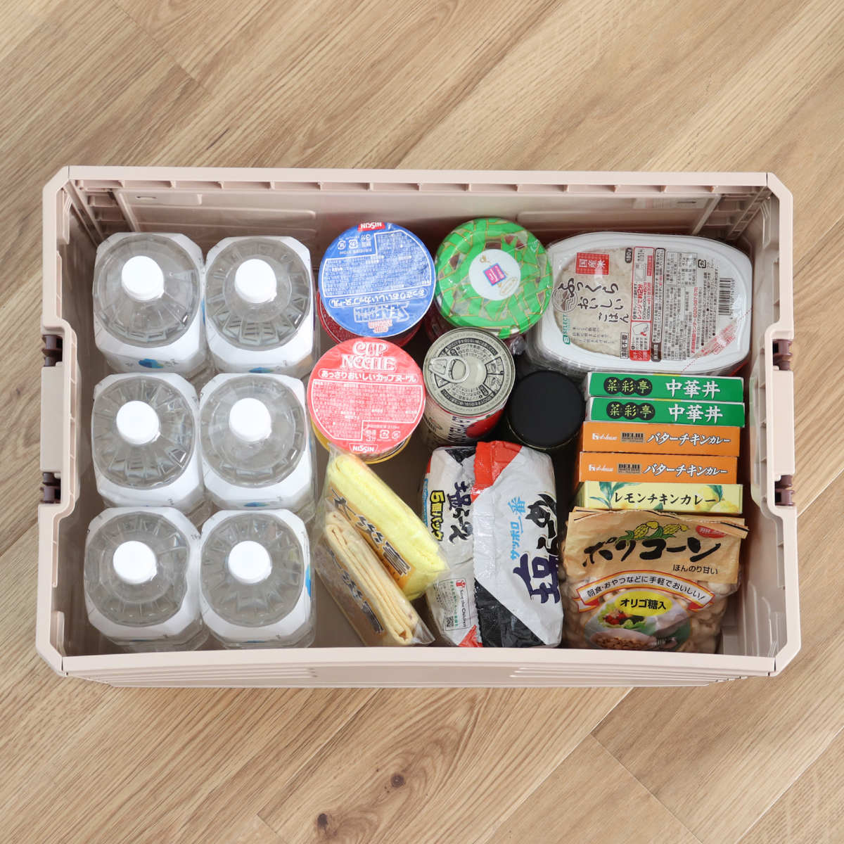 約75Lのたっぷり収納です。2Lのペットボトルを6本入れても食品を入れるスペースにゆとりがあります。パントリーでは食材や日用品のストックとして、災害時では備蓄品入れとして活躍します。