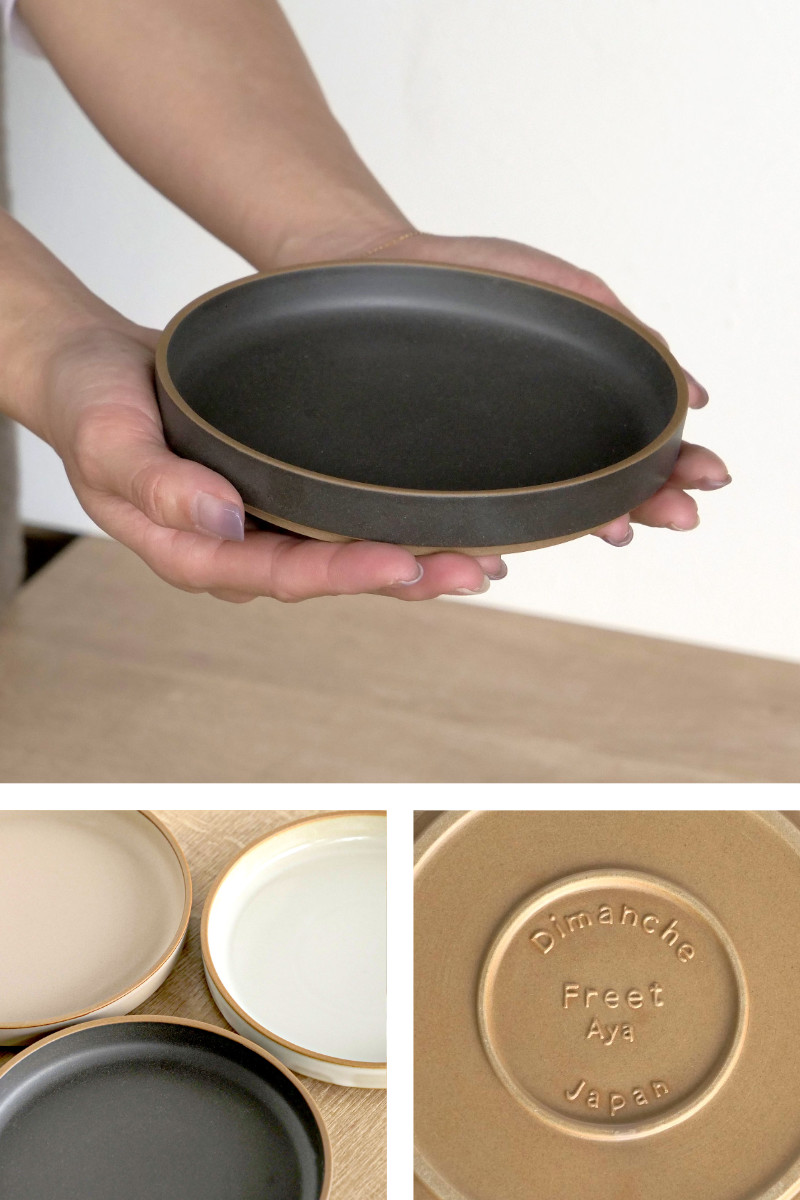 つるつるとした質感のホワイト、セミマットな質感のベージュ、ザラザラした手触りが特長的なブラック。カラーの違いだけでなく、風合いの違いも感じられるよう3種類の釉薬を使用しています。裏側は赤土の素材感がそのまま活かされてあり、ロゴがエンボス加工されたお洒落なデザインです。
