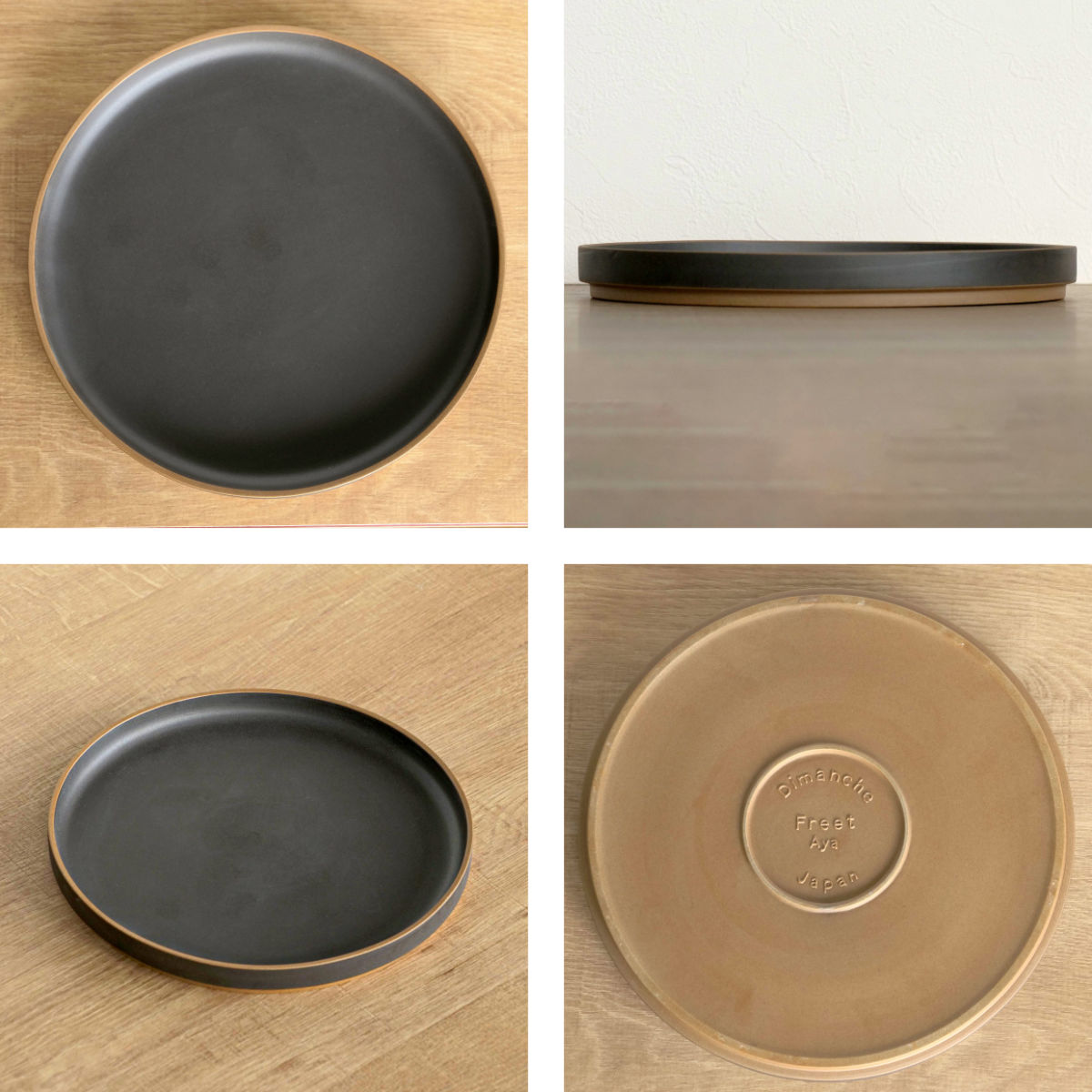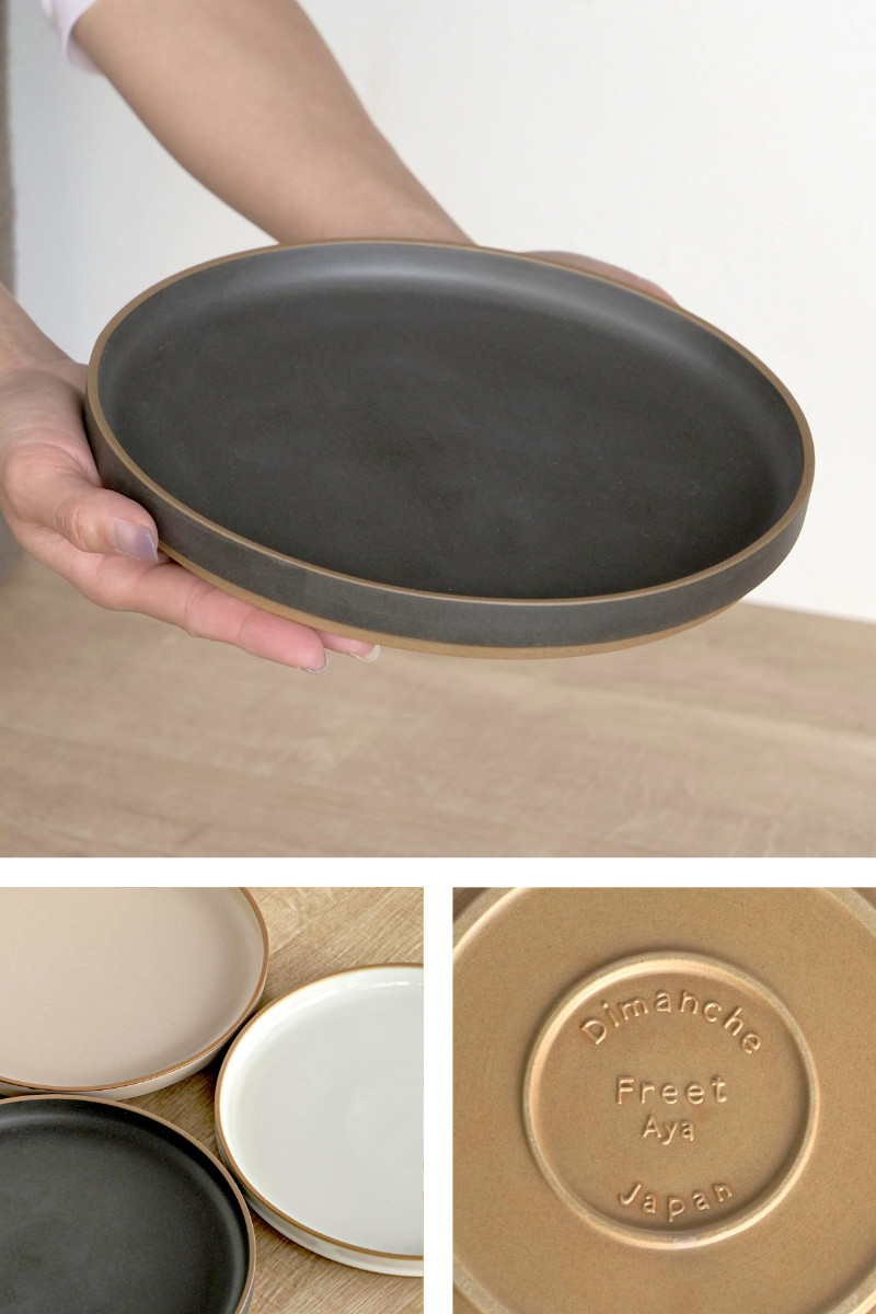 つるつるとした質感のホワイト、セミマットな質感のベージュ、ザラザラした手触りが特長的なブラック。カラーの違いだけでなく、風合いの違いも感じられるよう3種類の釉薬を使用しています。裏側は赤土の素材感がそのまま活かされてあり、ロゴがエンボス加工されたお洒落なデザインです。