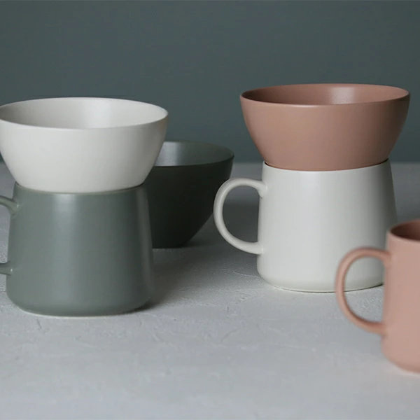 凛としてしとやかな女性をイメージして作られたダスティカラーのマリーンシリーズ。同シリーズの飯碗とセットで使うと、食卓を上品に美しく彩ることができます。マグカップの上には碗を安定して重ねることができるので、テーブルを広く使いたいときや、食器棚、キャビネットに収納するときに便利です。