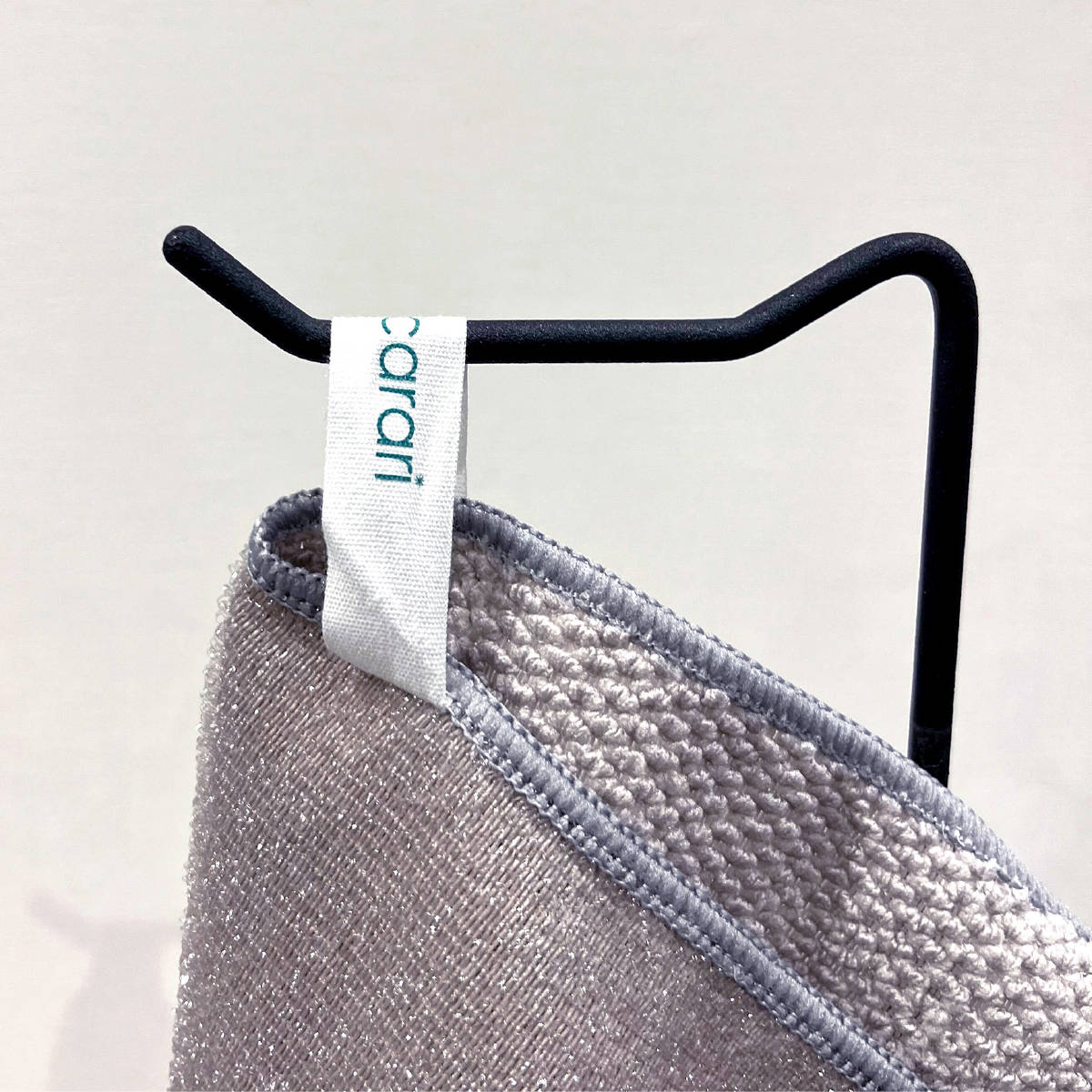 使いやすい場所に掛けて収納できるリボン付きです。洗って乾燥させる時もフックに吊るすだけ。2枚組なので、1枚使って乾かしている間にもう1枚使えて便利です。