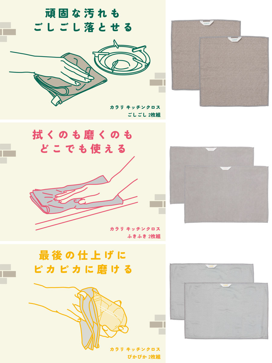キッチンのあらゆる場所のお手入れに使える「カラリ キッチンクロス」シリーズ。用途に合わせて使い分けることができる「ごしごし・ふきふき・ぴかぴか」の3種類。掃除をする時にどこに何を使って掃除したら良いのか悩んでしまう方にピッタリです。