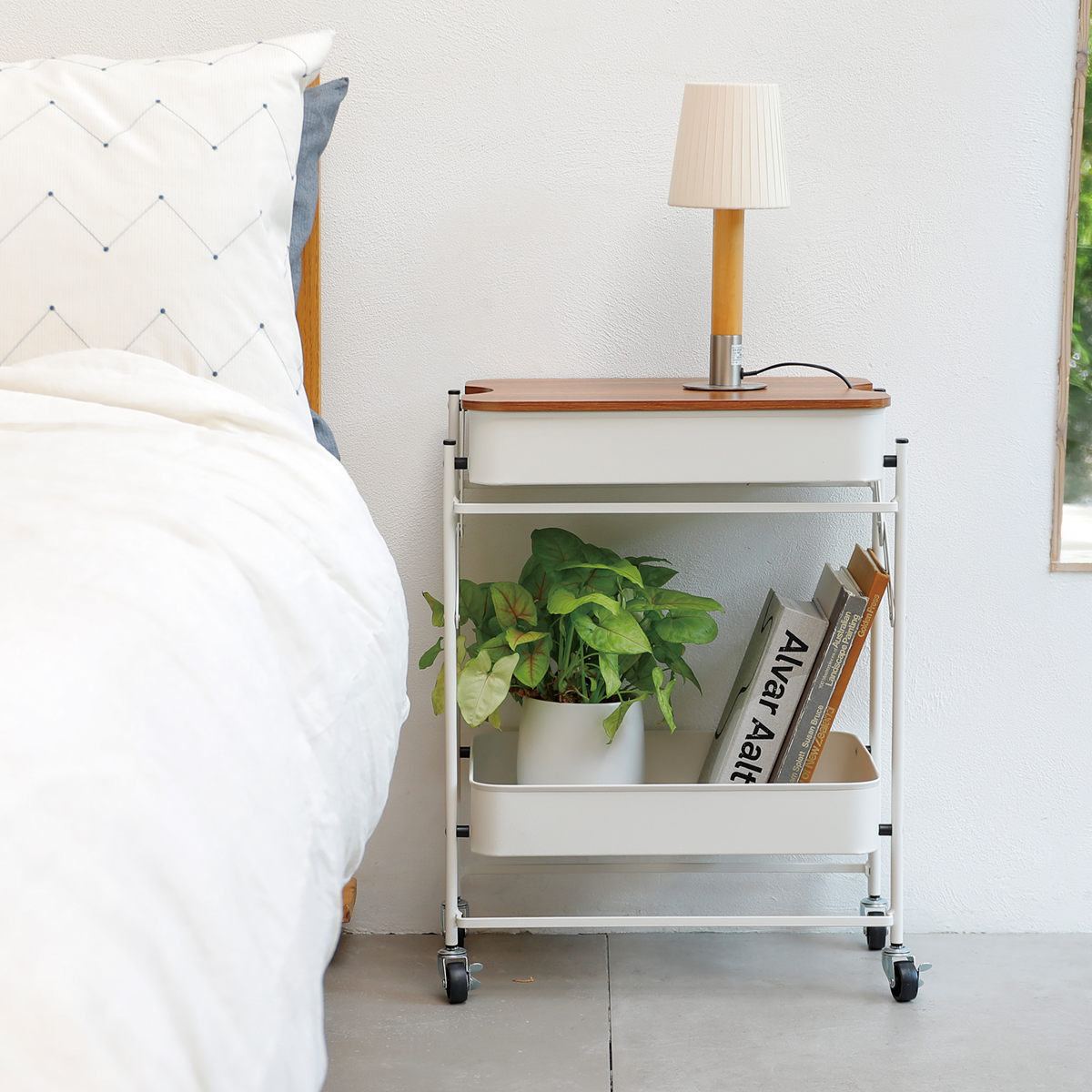 キッチンやリビングで使用するのはもちろん、寝室やランドリールームでの使用もおすすめです。ベッドサイドでは照明やティッシュケースなどを置いたり、天板の下に生活感のある物を収納。洗面所やランドリールームでは洗濯関連のアイテムを収納して便利に使えます。