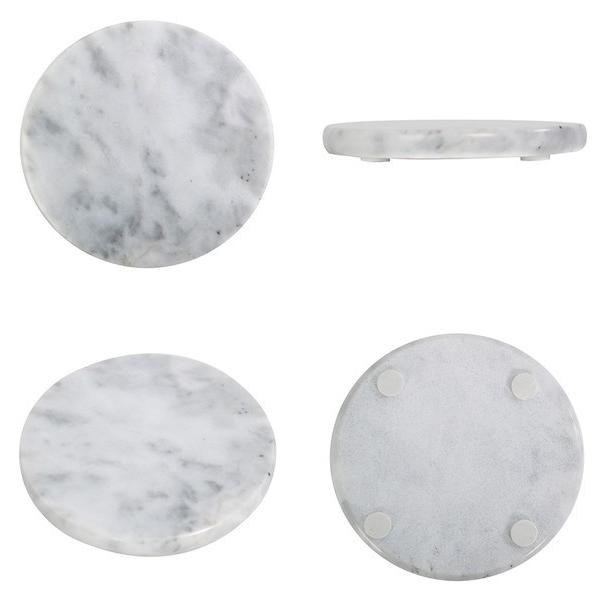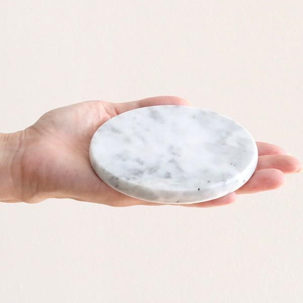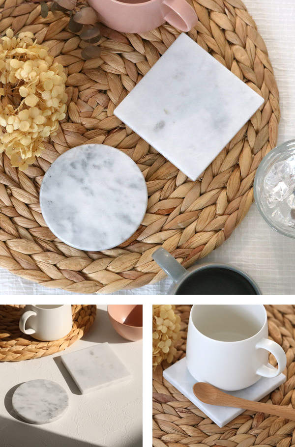 天然の大理石を使用したコースターは、一つ一つ石の表情が異なるのが特徴。厚みがあり、ずっしりとした重厚感があります。裏面には傷防止の滑り止めクッションが付いており、テーブルや棚上の接地面を傷付ける心配もありません。