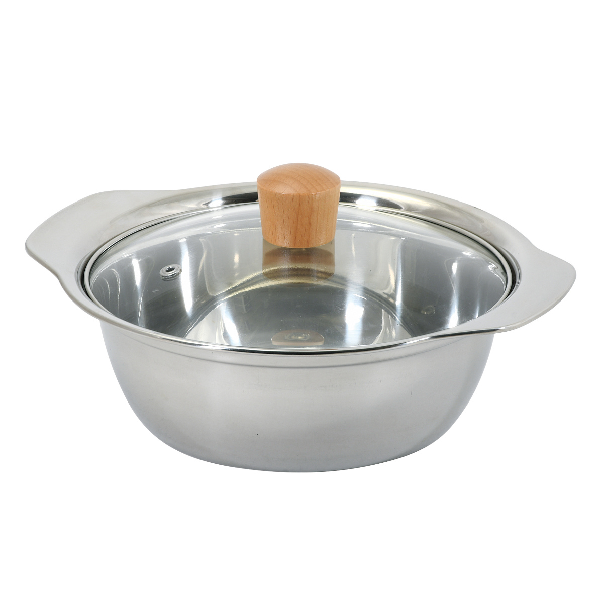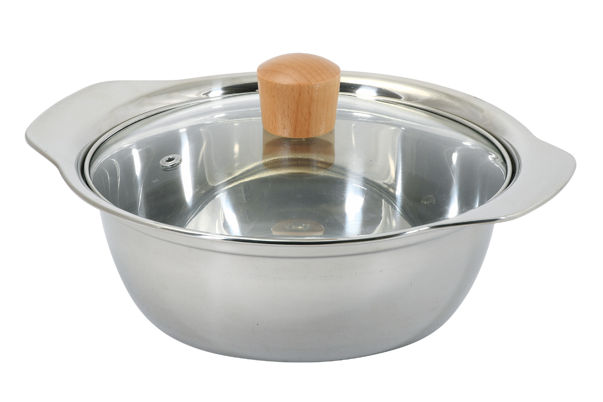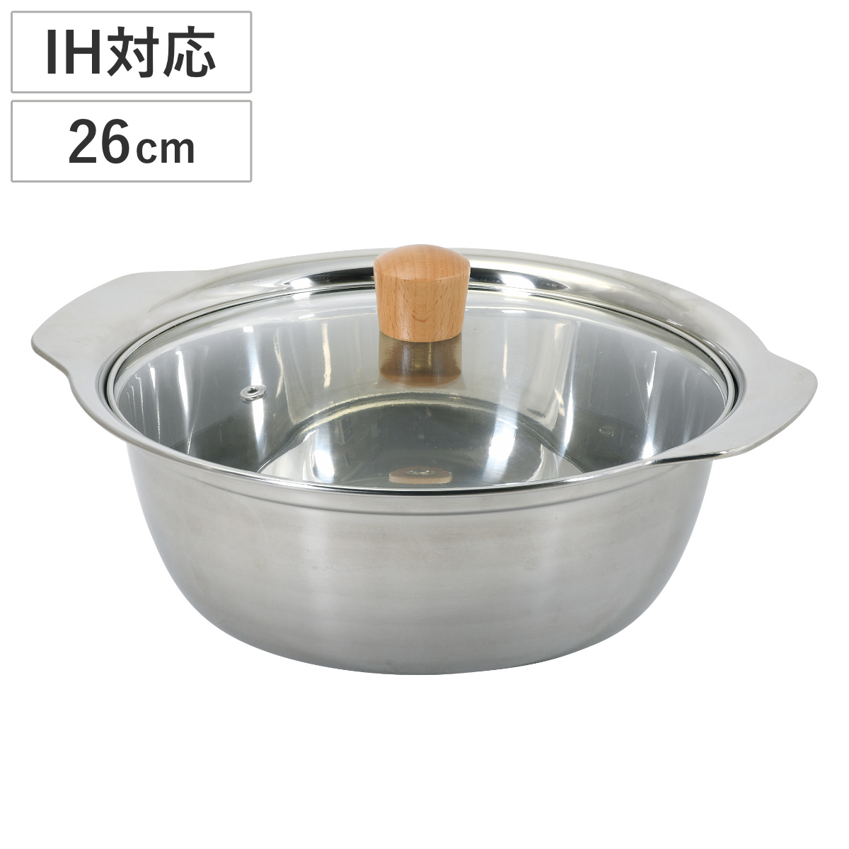 | 材質 | 本体:ステンレス鋼(クロム14%) 蓋:強化ガラス製器具(全面物理強化) 蓋縁リング:ステンレス鋼 つまみ:天然木 |