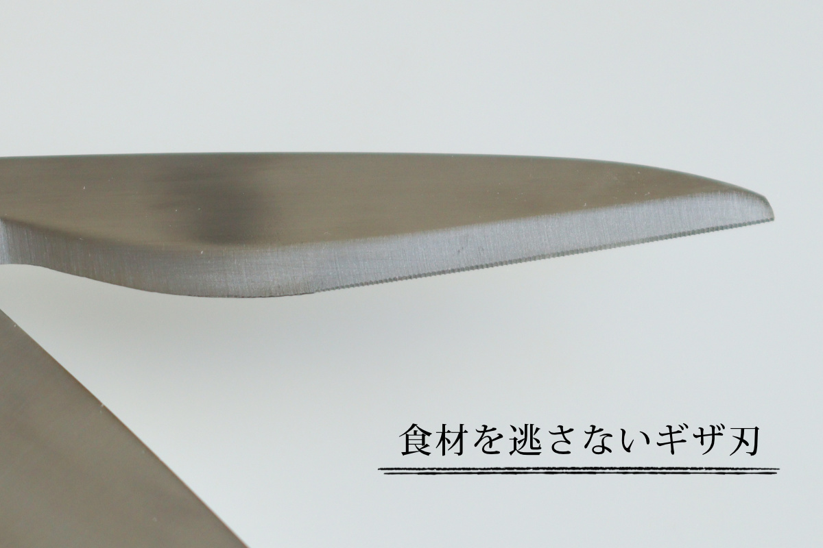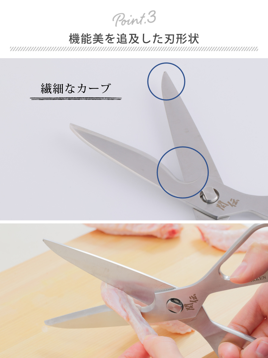 カーブ形状の刃は食材をとらえやすく、しっかり力をこめて切ることができます。また刃の根本部分がくぼんでいるので、細い骨が滑りにくく切りやすいです。