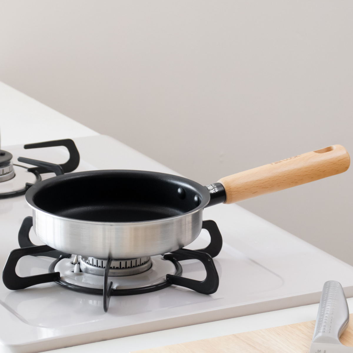 持ち手には手になじみやすく、加熱中でも熱くなりにくい天然木を使用しています。スタイリッシュでありながら、ナチュラルな雰囲気のキッチンにも馴染むデザインです。