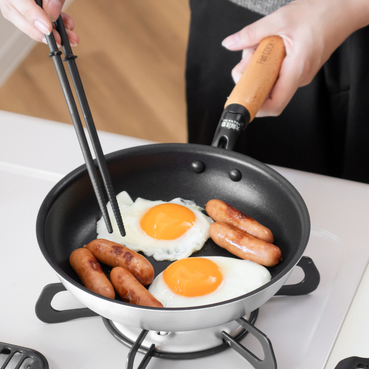 持ち手には手になじみやすく、加熱中でも熱くなりにくい天然木を使用しています。スタイリッシュでありながら、ナチュラルな雰囲気のキッチンにも馴染むデザインです。