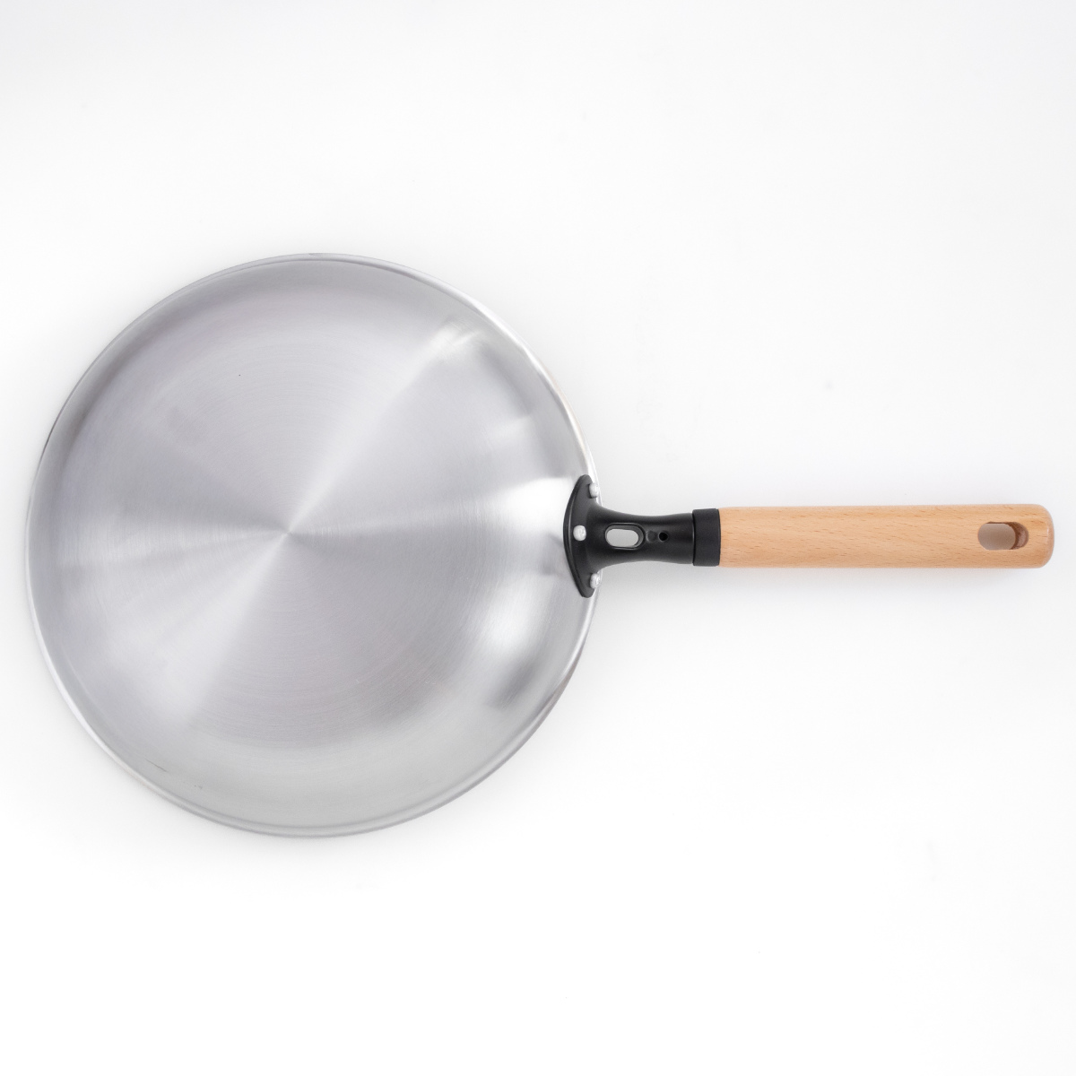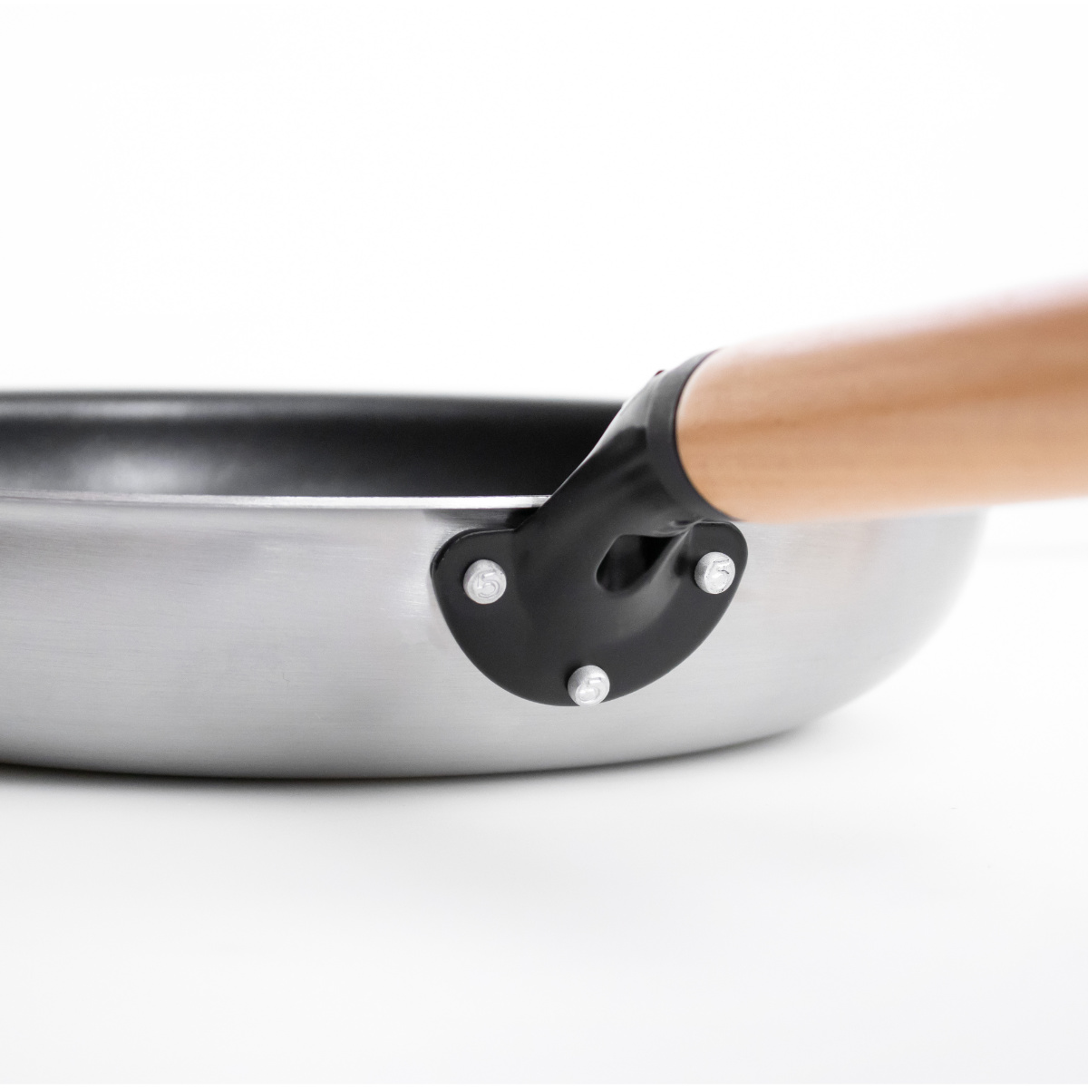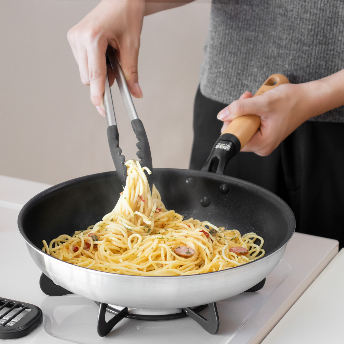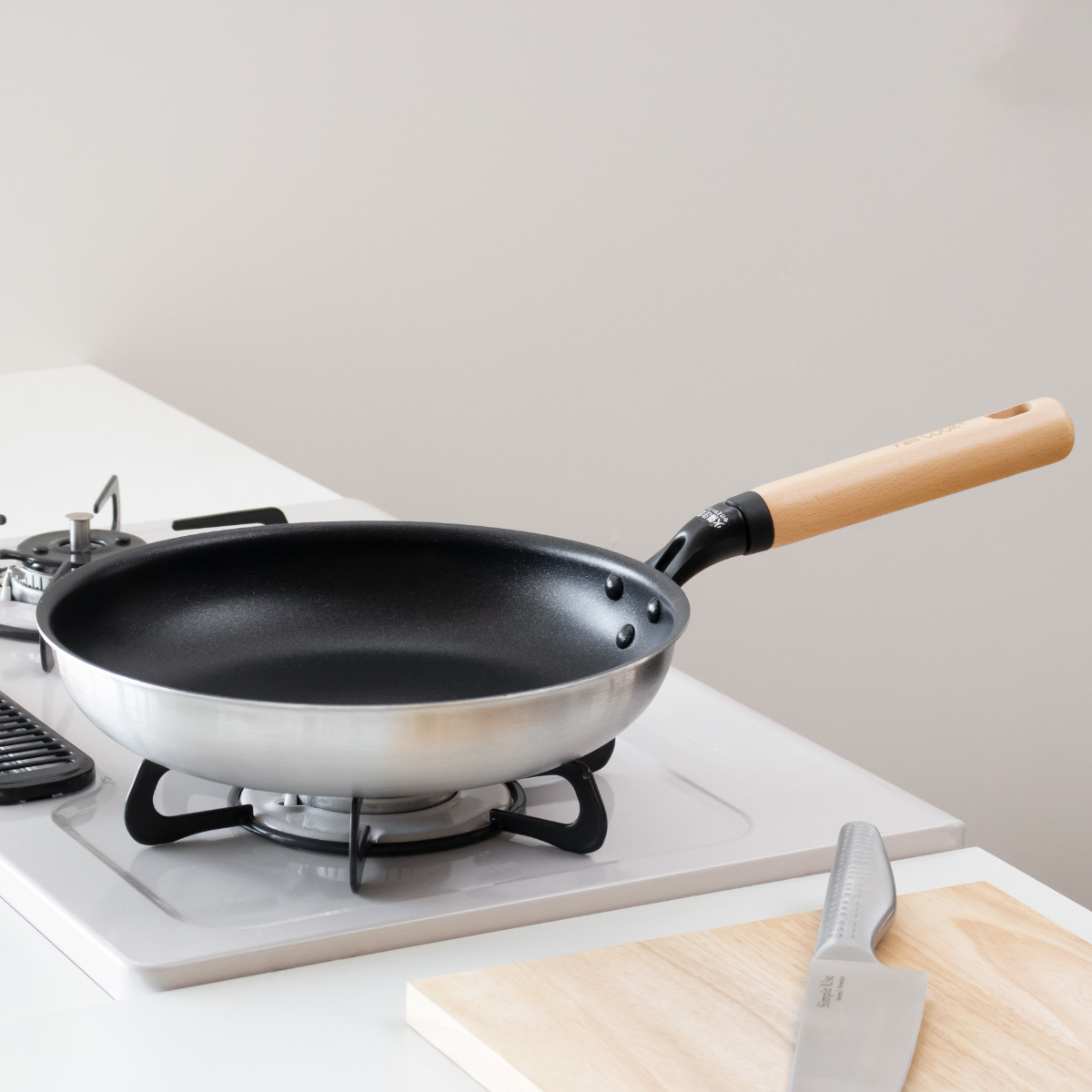 持ち手には手になじみやすく、加熱中でも熱くなりにくい天然木を使用しています。スタイリッシュでありながら、ナチュラルな雰囲気のキッチンにも馴染むデザインです。