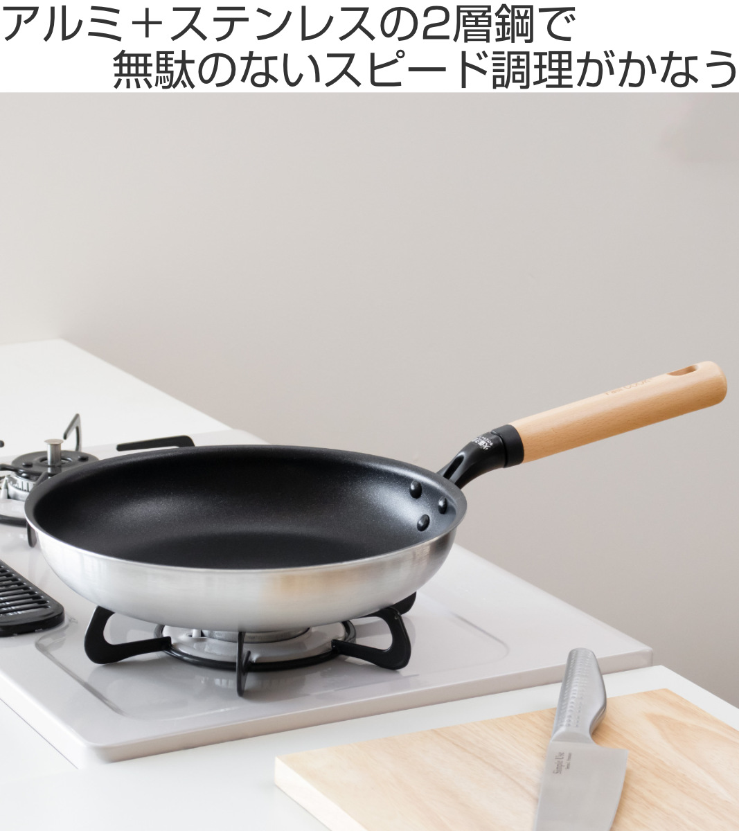 無駄のないスピード調理がかなう、アルミ+ステンレスの2層鋼フライパンです。熱伝導の良いアルミと保温力の高いステンレスを合わせているので、すばやく加熱でき、かつ全体にムラなく熱を伝えます。従来品と比較しても加熱の早さ、沸騰力が違います。