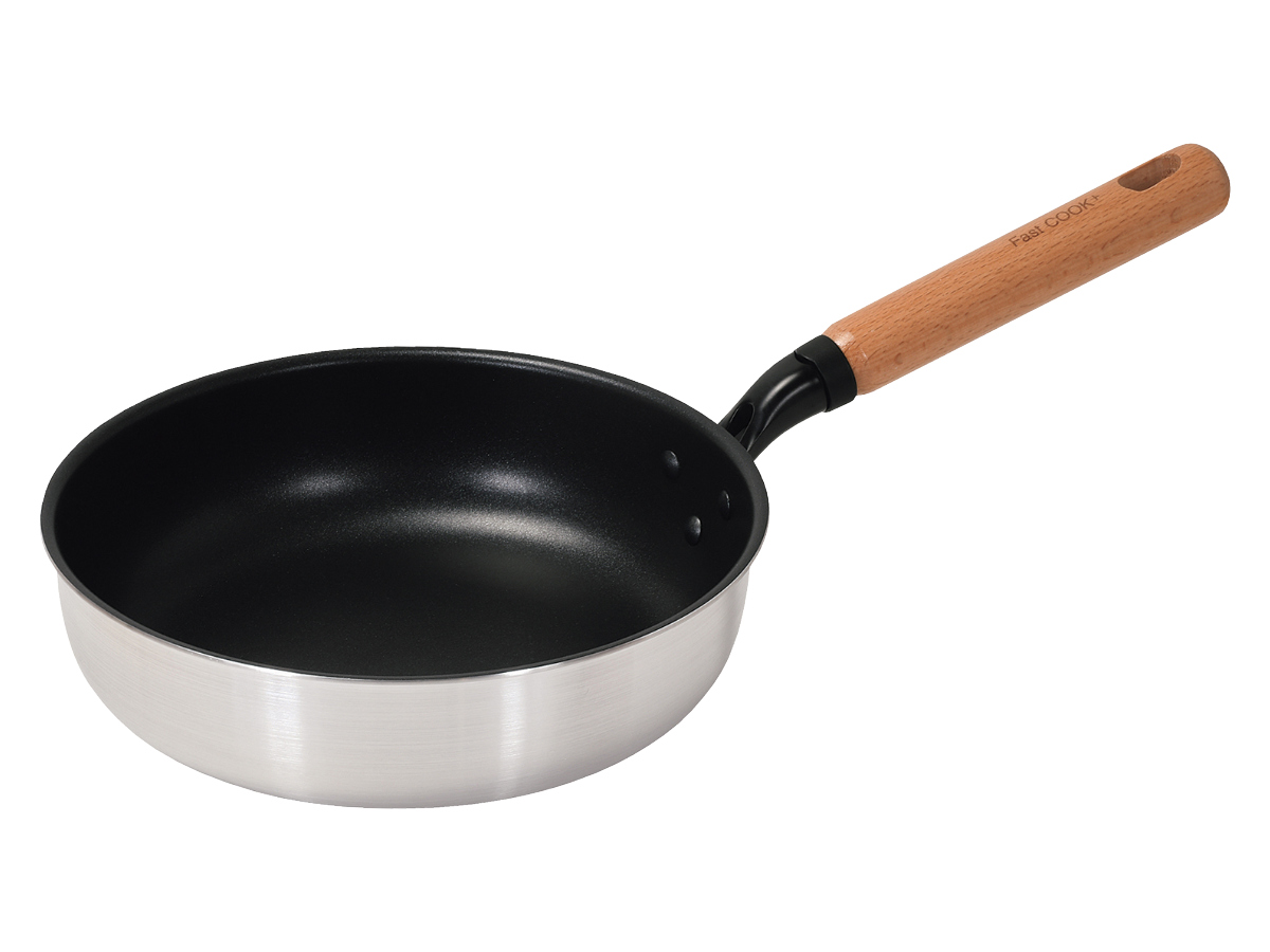 | 材質 | 本体:ステンレス鋼、アルミニウム合金 取っ手:天然木 表面加工:ふっ素樹脂塗膜加工(内面) |