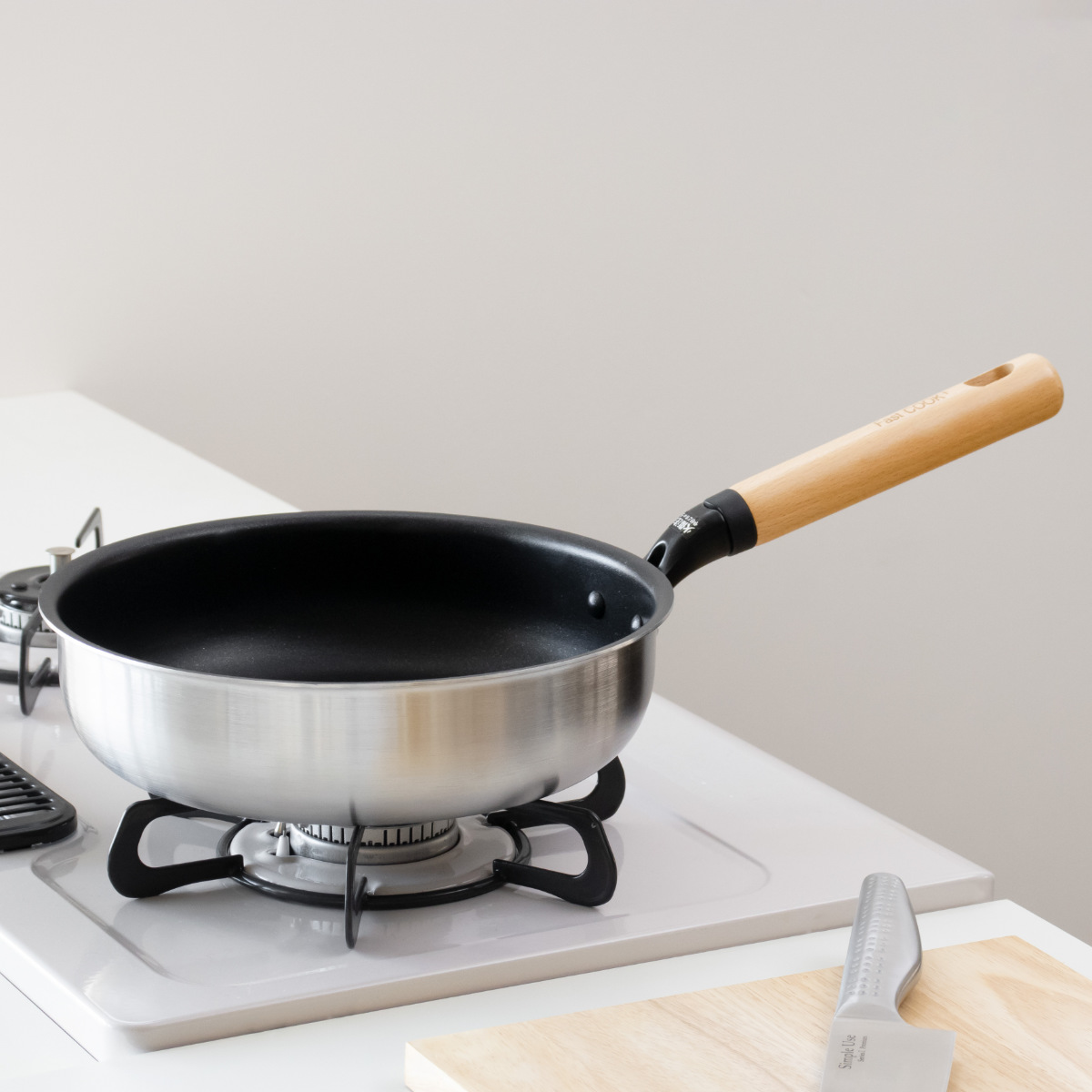 持ち手には手になじみやすく、加熱中でも熱くなりにくい天然木を使用しています。スタイリッシュでありながら、ナチュラルな雰囲気のキッチンにも馴染むデザインです。