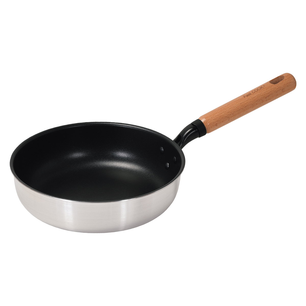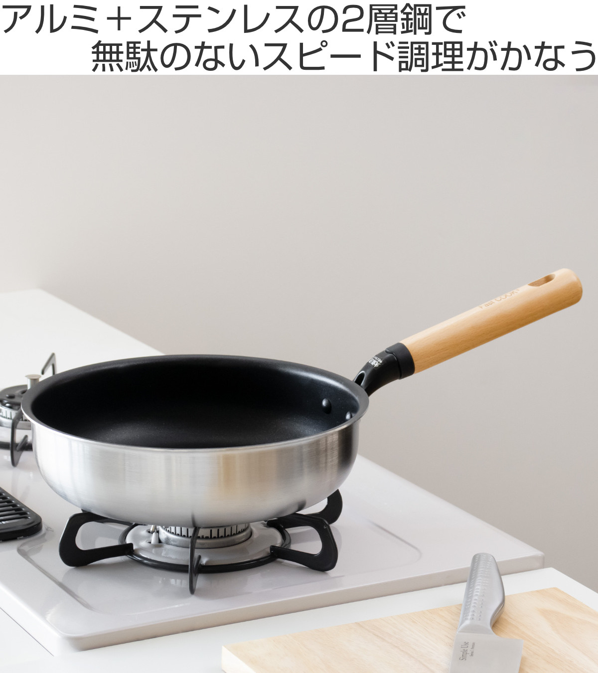 無駄のないスピード調理がかなう、アルミ+ステンレスの2層鋼フライパンです。熱伝導の良いアルミと保温力の高いステンレスを合わせているので、すばやく加熱でき、かつ全体にムラなく熱を伝えます。従来品と比較しても加熱の早さ、沸騰力が違います。