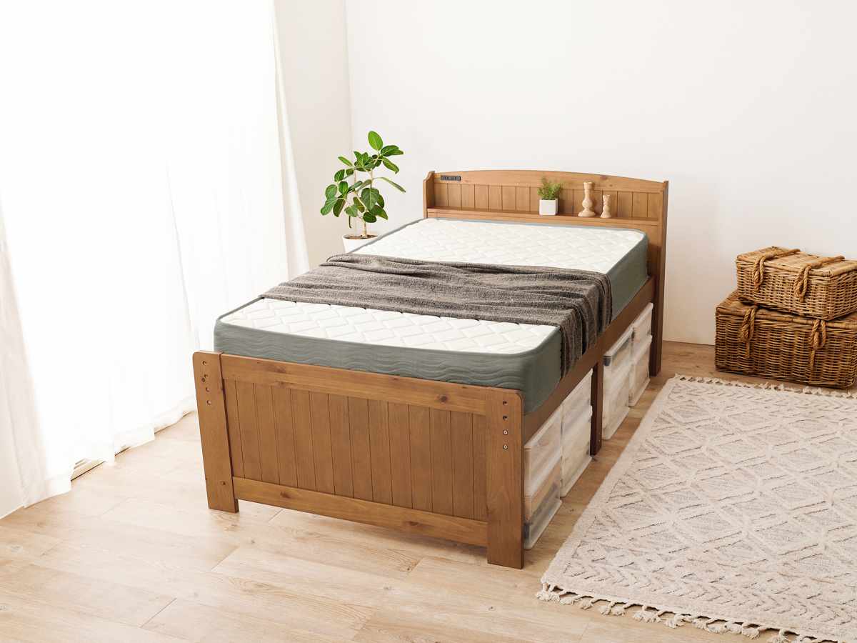 天然木を贅沢に使用したカントリー調のすのこベッドフレームと、ソフトな寝心地のポケットコイルマットレスのセットです。フレームには木の温もりを感じられる、きめ細やかなパイン材を使用しているので、美しい木目と経年による色の変化をお楽しみいただけます。
